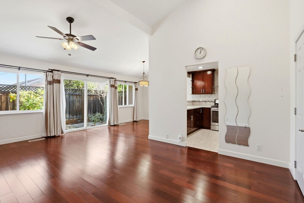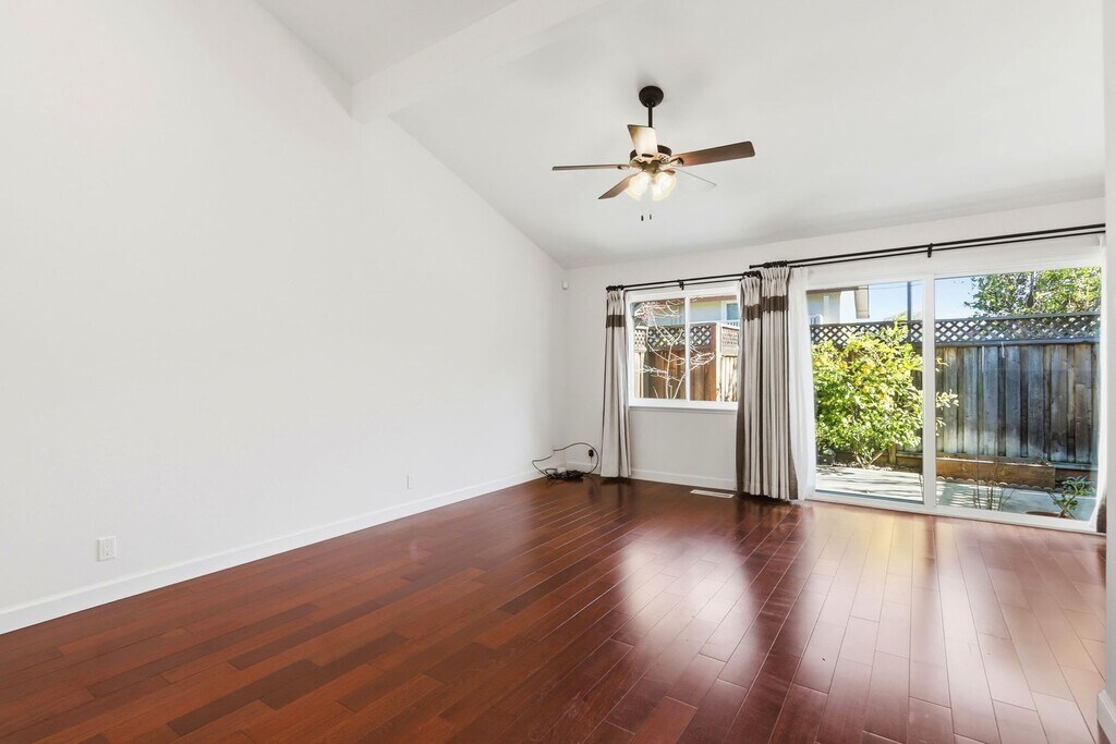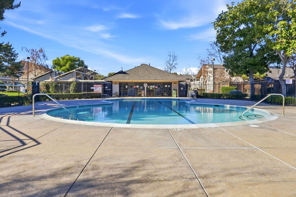 Living room with laminate floors. Kitchen granite counter tops, stainless steel appliances: refrigerator, stove, microwave, dishwasher and garbage disposal. Washer and dryer in garage. Guest parking and community swimming pool. Central A/C and heat HOA and garbage paid. Conveniently located to San Tomas Expressway.