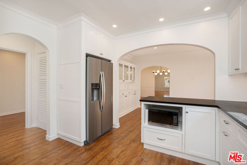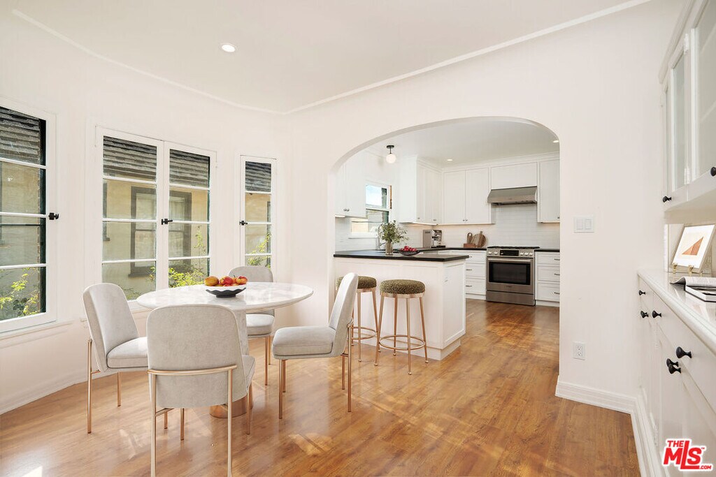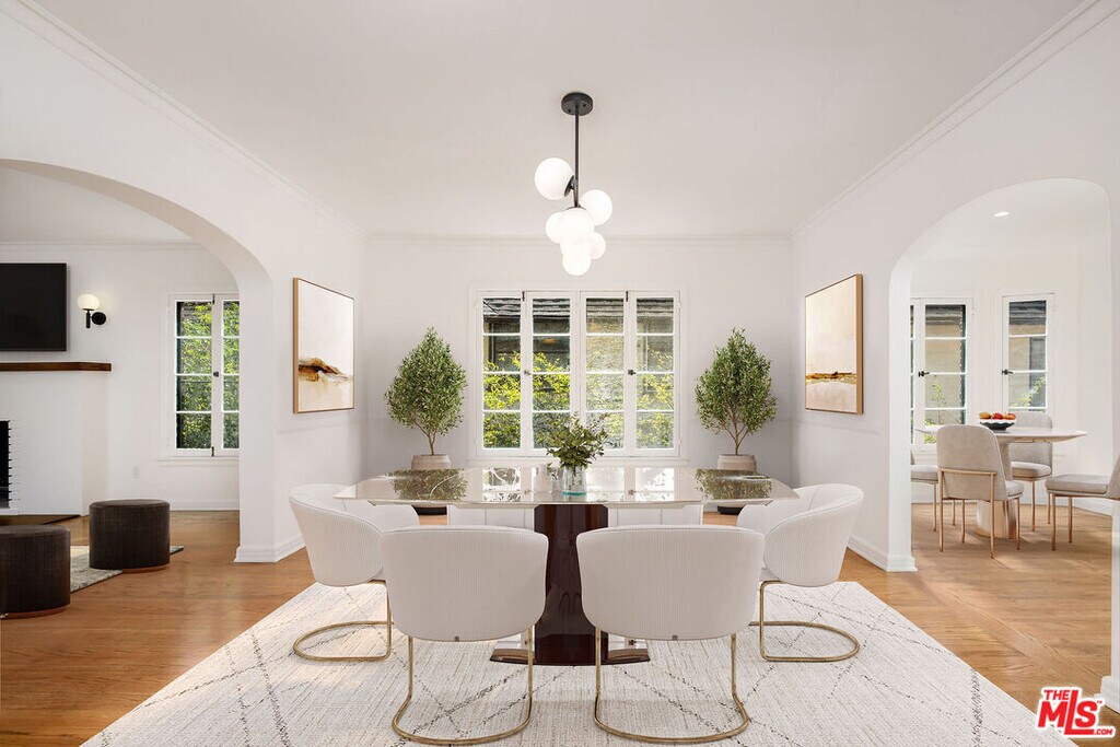 Charming, spacious, light-filled upper unit in English Tudor duplex nestled along tree-lined Orange Drive. Oak wood floors flow throughout. A sunlit living room with a fireplace and adjacent office opens to an elegant formal dining room featuring original built-ins, which seamlessly connects to breakfast room and a large, updated kitchen with abundant custom cabinetry, leather-finished granite counters and stainless-steel appliances. Hallway with multiple storage closets leads to three generously sized bedrooms, two updated baths with porcelain counters, and a laundry room. Outside, the shared backyard offers a sense of privacy among mature trees, along with access to a two-car garage. Located in one of Los Angeles' most desirable neighborhoods, close to Larchmont plus great spots like Sycamore Kitchen, Angelini Osteria & Republique. Third Street School District. MLS# 25603221