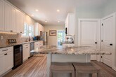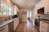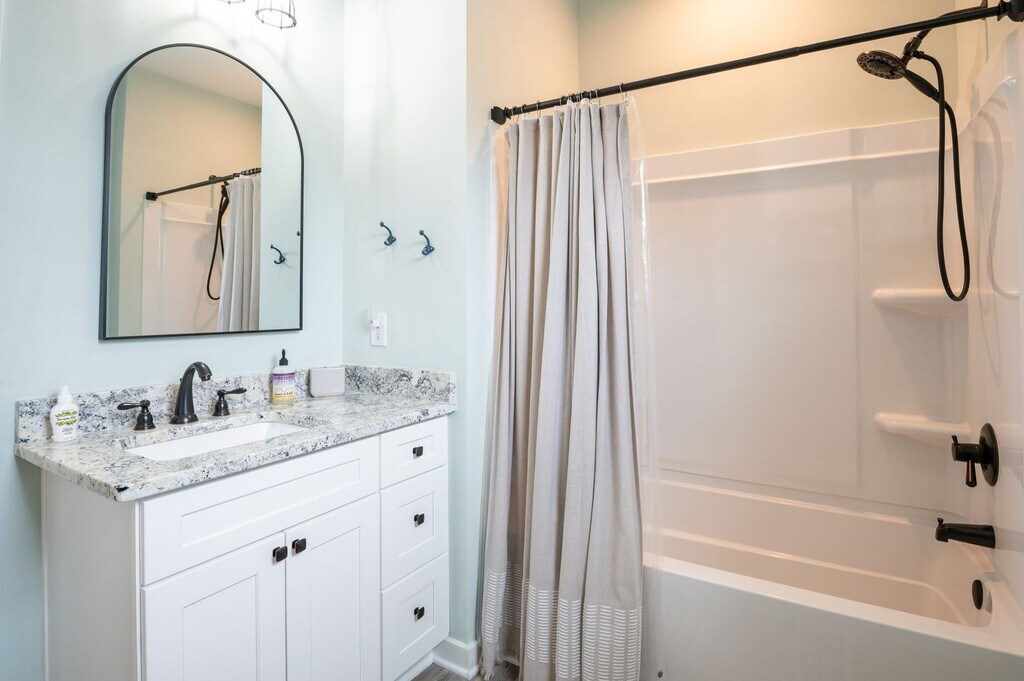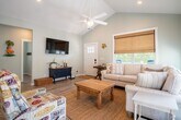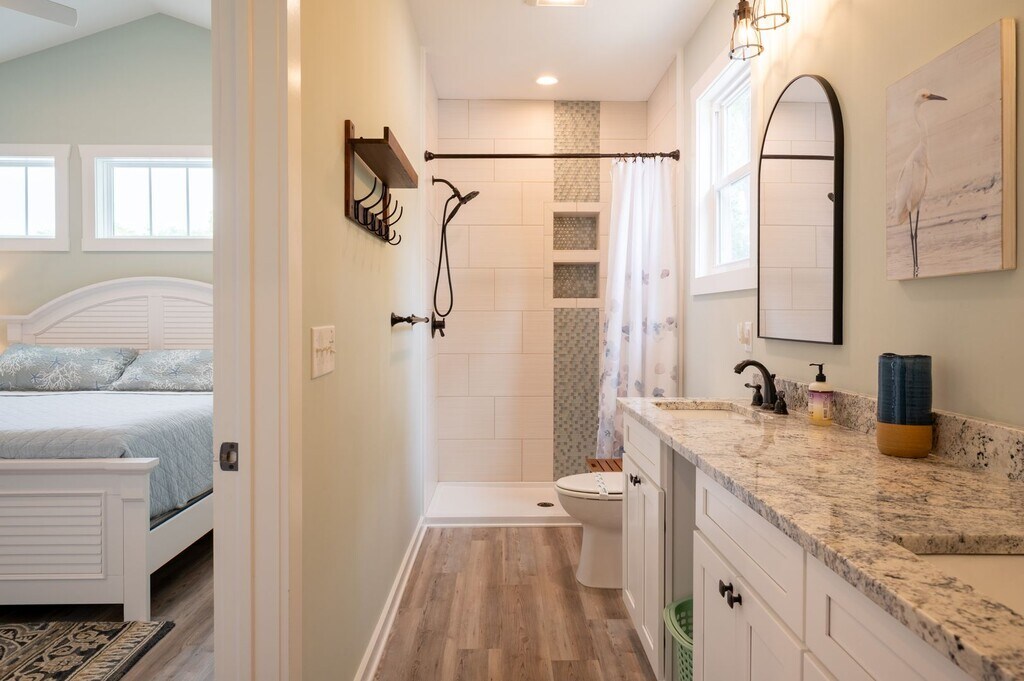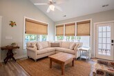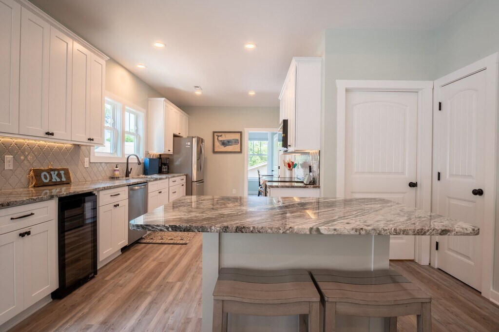 This 2022 new build home is the perfect place to enjoy the off-season and get away from the cold winter in the North. Don't forget to bring the family dog! Furry friends are welcome here (fenced-in backyard!) Vaulted ceilings and transom windows bring in the natural light throughout. High-end, comfortable furnishings and quality fixtures abound in this beautifully appointed home. This gracious beach house comes with everything you need to cook gourmet meals at home! Host your new friends in the huge shaded area under the house with POLYWOOD outdoor furniture. With a finished ceiling and generous outdoor lighting, you can shuck oysters on the raised bar, relax in the outdoor living room, and eat lunch at the outdoor dining table! This 4-bedroom home has a primary king suite with an ensuite bath with an extra-long granite top double vanity and a custom tile shower with a low threshold entry and a massive walk-in closet. There is a queen bed in one bedroom and a pyramid bunk twin over full with double closets in both bedrooms. A shared hallway bath with granite counters, antique bronze fixtures, and a rain shower for your pleasure. The fourth bedroom is a converted office with a twin, desk, and chair. This property is located in a peaceful, shady neighborhood with a 3-minute drive to the beach. Just two blocks from the home, the Town of Oak Island offers public access fishing in the Davis Canal: SW 6th St has a pier, and SW 5th St has a floating dock. Boats and trailers are easily accommodated at the property with its large private driveway. Call now before this ideal rental is spoken for! First-come, first-serve. **Please contact Ann at Sea Coast Rentals for further information and/or to check available dates. Check out all our rentals: both furnished off-season and unfurnished long-term. **