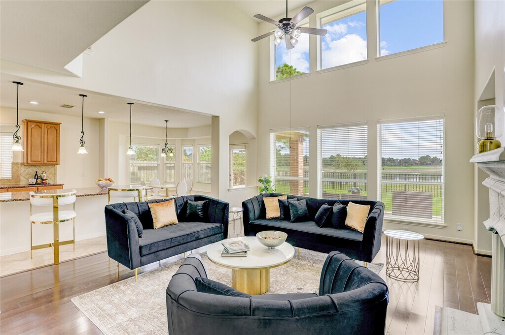 Live on the Lake front Water ! Magnificent Lake front Shadow Creek home is ready for immediate occupancy. The inviting front elevation offers wonderful curb appeal & is complemented by beautiful trees & landscape. Tasteful updates & fresh paint add to the charm. Entry foyer & gracious formals flank the main entry,which flows to the spacious Living room,large kitchen & open plan with breakfast room beaming with natural light,all overlooking the Lake & patio through the full-length windows. High ceilings throughout.The home boasts of a chef's island kitchen,breakfast bar with seating. Bay windows in the breakfast & primary for comfort. The Primary suite is on the 1st Fl. The primary suite offers a tray ceiling,space for a sitting area,and views of the back yard & lake. The entire home boasts of wood/ engineered woods & laminate flooring. Lovely game room,media room & den. Roof was changed in 2022. Large backyard with extended patio. Quiet neighborhood & no thru traffic.Must visit! MLS# 21328453