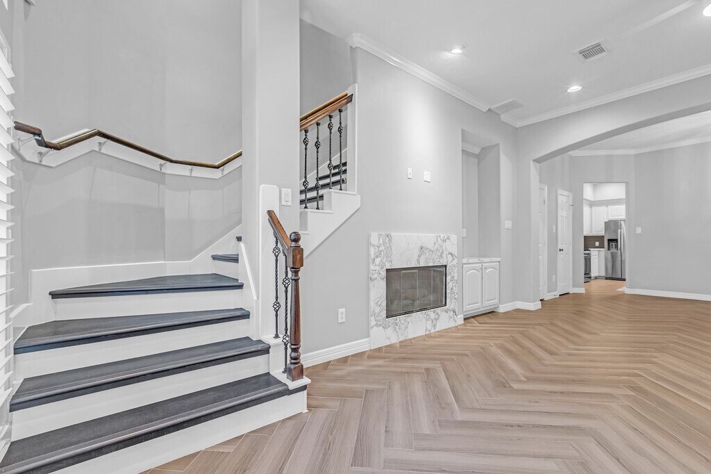 This Gorgeous three-bedroom gated community townhome is ready for you to move in. Recent kitchen and flooring renovation. The townhome has porcelain floors throughout the downstairs. The spacious living and dining room flows into the kitchen and breakfast room. Stunning,stylish quartz countertops combined with stainless steel appliances,an island sink counter,and abundant cabinet space in the kitchen. The huge primary bedroom with the two secondary bedrooms are on the second floor with no carpet. The primary has a fabulous en-suite bathroom with a frameless shower and whirlpool tub enhanced with quartz counters. On the third floor is an enormous game room or a fourth bedroom. The gated community has remote access control to the garage area. The front of the townhome is your private cozy courtyard,beautifully landscaped. The community is located on a cul-de-sac and at one of the private entrances to the Lakes of Parkway subdivision. Refrigerator,Washer,Dryer included. MLS# 75338706