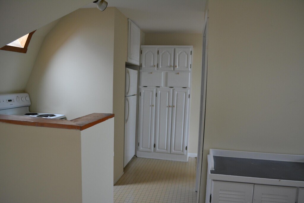 Large Third Floor/Top Floor Two Bedroom. Open floor plan. Natural light throughout. Skylights in living room,dining room and bathroom. Open kitchen with refrigerator and range. Bedroom #1 ... large with walk-in closet and natural light. Bedroom #2 ... two closets and a sliding door to a balcony. Large bath with shower/tub combination. Walk-in storage closet off of dining area. Large basement with coin operation laundry. Parking on street with permit ($25 year).