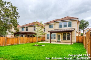 Welcome to 1355 Pinnacle Falls. This wonderful three-bedroom, two-and-a-half-bath home is located in the highly sought-after gated community of Villas at Canyon Springs. It features an open floor plan that is ideal for entertaining. The downstairs area includes an updated kitchen equipped with stainless steel appliances, a breakfast bar, a cozy family room, a convenient laundry room, and a half bath for guests, all designed with step-free access for ease of movement. Upstairs, you'll find a spacious master bedroom featuring his and hers closets, a double vanity, a separate garden tub and shower, two additional bedrooms, and a small loft area. The backyard is complete with a covered patio that has a fan and an extended slab for outdoor furniture, making it great for relaxation. Community amenities include a pool, tennis and basketball courts, and a playground. Additionally, this property feeds into highly acclaimed Comal School District, convenient to HWY 281, Stone Oak Parkway, Village at Stone Oak shopping center, restaurants, and Canyon Springs Golf Course. Also available for Sale.