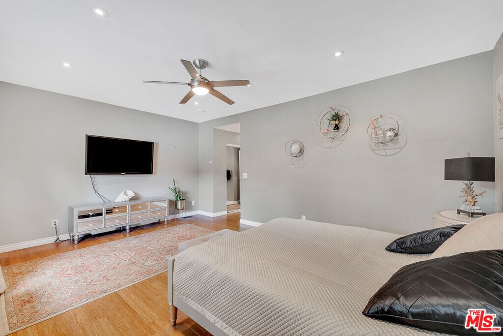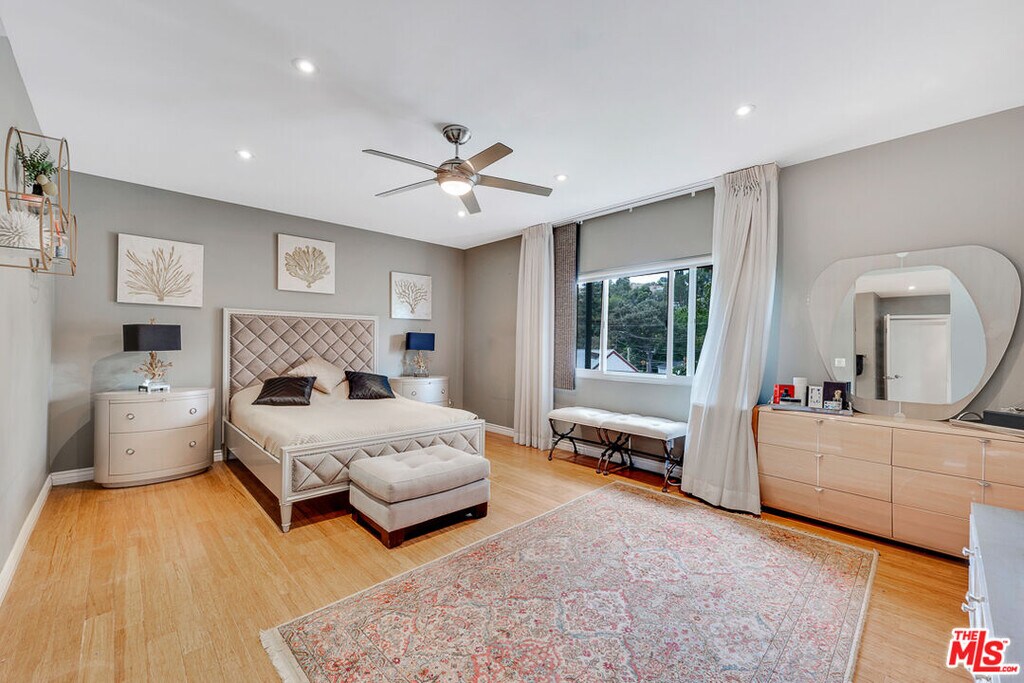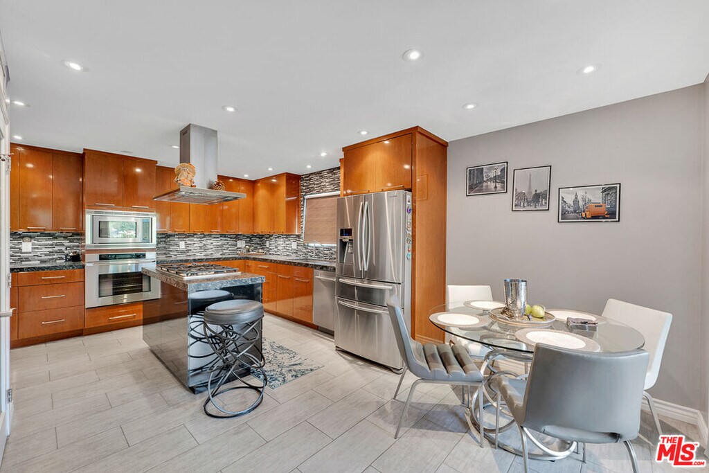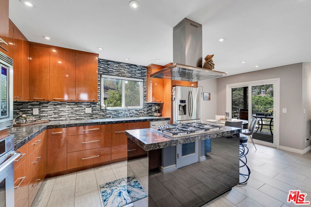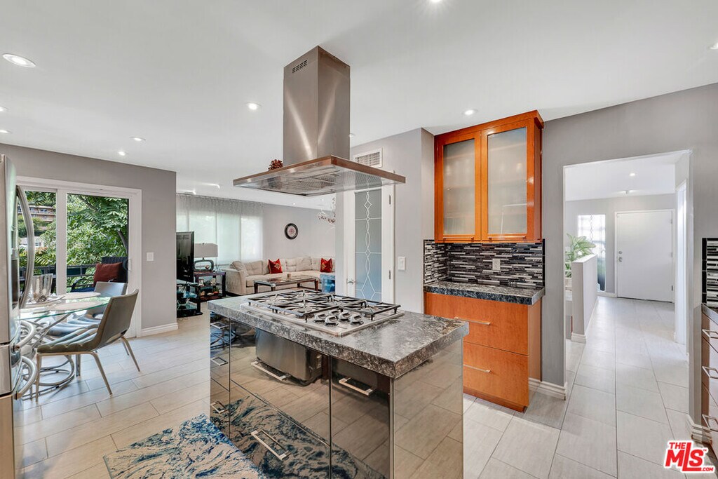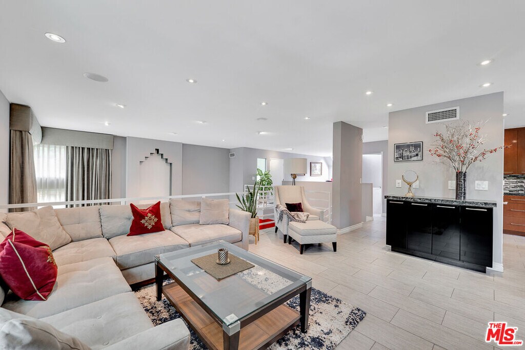Nestled south of Ventura Boulevard in the highly coveted Sherman Oaks neighborhood, this move-in-ready home offers an exquisite blend of style, comfort, and breathtaking hillside views. Every corner of this residence has been thoughtfully designed to elevate your living experience. On the top floor, a sun-drenched dining room takes center stage, framed by floor-to-ceiling skylight windows that flood the space with natural light which creates a perfect space for memorable meals with loved ones. The chef's kitchen is a culinary dream, boasting premium appliances, a generous center island with a six-burner stove, and abundant storage and walk-in pantry. Step onto the spacious balcony, where your mornings will begin with a cup of coffee and panoramic views that embrace the home. The lower level impresses with dramatic two-story vaulted ceilings and a dedicated living area tailor-made for entertaining. Complete with a stylish bar, wine fridge, and a cozy fireplace, it's the perfect setting for hosting guests or enjoying relaxed evenings. All three bedrooms are conveniently located on a lower level. The primary suite is a retreat unto itself, offering a refined ensuite bathroom with a double vanity, two closets including a walk-in, and a luxurious walk-in shower with a waterfall showerhead and striking black tile design. The second bedroom features a walk-in closet and an elegant ensuite bathroom with a sizable walk-in shower. Third bedroom is just as specious. Outside, the charm continues with a private yard oasis, ideal for weekend barbecues and unwinding amidst the tranquil hillside scenery. Located mere moments from Sherman Oaks' vibrant restaurants, trendy bars, boutique shopping, entertainment, and a top-rated charter school, this home combines unparalleled convenience with the allure of scenic living. Don't miss the chance to make this exceptional property your home! The property now features different furniture. MLS# 26638771