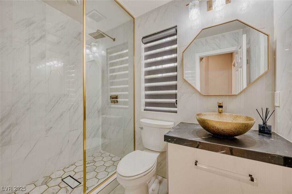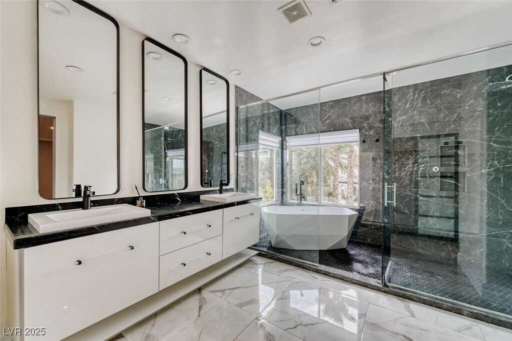 Experience a reimagined oasis that exudes modern elegance. Enter through an oversized contemporary iron door into soaring ceilings that flood this fully designer-remodeled home with natural light. The kitchen features a striking waterfall island with breakfast bar seating. A board-and-batten accent wall paired with an exquisite chandelier in the formal dining room adds depth and sophistication to the interior. Outdoors, enjoy a true entertainer’s retreat with a full outdoor kitchen, pergola-covered patio, picturesque pool and spa, tranquil waterfall feature, and lush landscaping—making al fresco dining an everyday luxury. The spacious primary suite impresses with a showroom-style closet and a spa-inspired bath highlighted by a soaking tub within a custom shower. This five-bedroom, four-bath residence offers outstanding value for luxurious living and is a must-see in the heart of Summerlin.