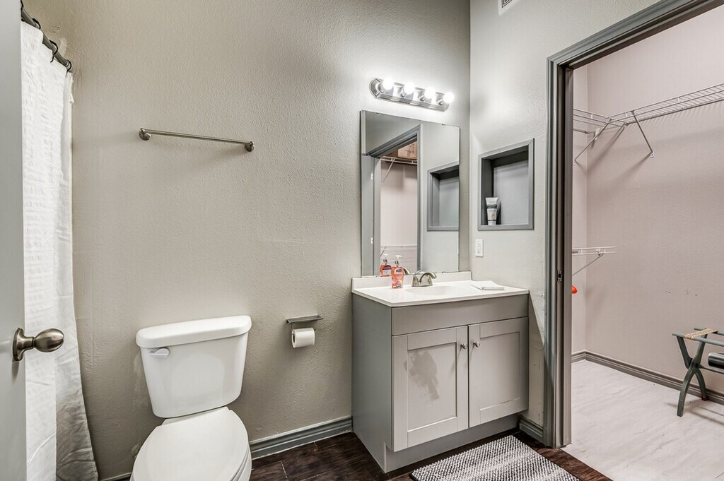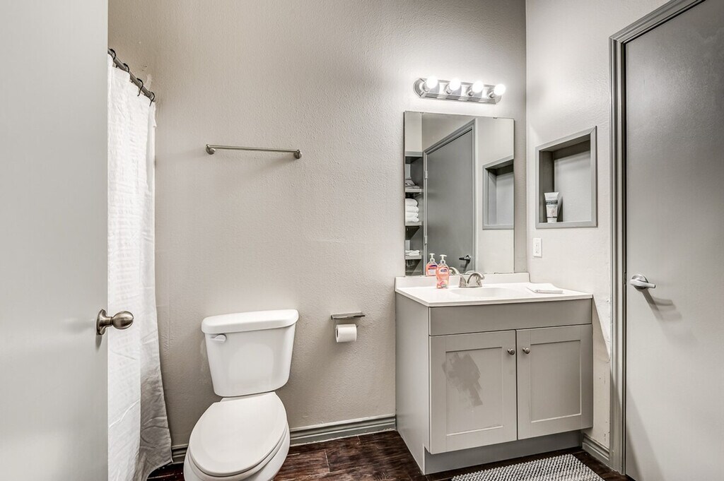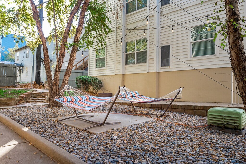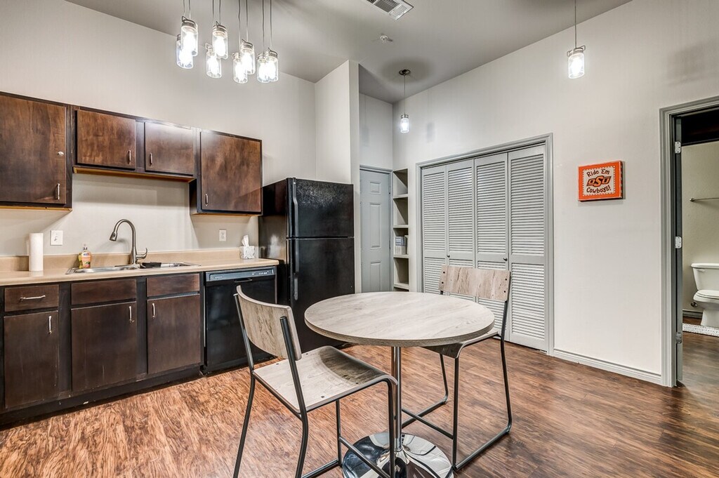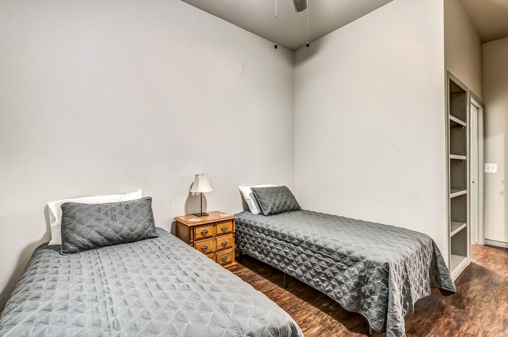 Feel at home in this centrally located condo near Oklahoma State University, just a block and a half from Boone Pickens Stadium. This 2-bedroom, 2-bathroom apartment sleeps up to five and offers a spacious living area and kitchen with private bathrooms in each bedroom suite. Enjoy the tranquility with a pool-side view. The apartment is family and kid-friendly, featuring fast Wi-Fi and a community pool. The patio comes equipped with hammocks and gas grills, and there is private laundry in the unit. The apartment includes free garage parking and access to the condo’s pool, outdoor grill and seating, and hammock area. Situated near Oklahoma State University, this condo offers easy access to Boone Pickens Stadium and the surrounding attractions. Its central location ensures you are close to everything you need. The house features one bedroom with a queen-size bed and two twin-size beds in the second bedroom. The two full bathrooms are roomy with large walk-in closets. [SI]
