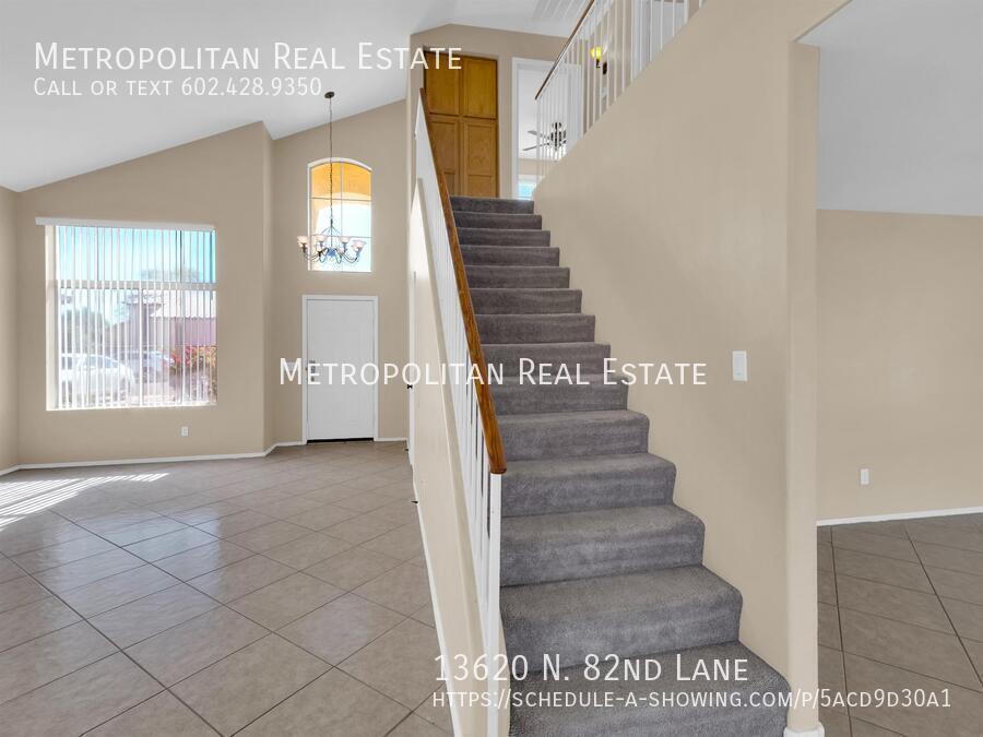 Beautiful 2-story home in Peoria with 3 bedrooms and 2.5 baths. Features a large formal living room with vaulted ceilings and tile flooring throughout. The eat-in kitchen offers stainless steel appliances, granite countertops, and ample cabinet space, opening to a cozy family room. Two-tone paint, carpeted bedrooms, and ceiling fans throughout. The primary suite includes a walk-in closet and a bathroom with dual sinks and separate tub/shower. Enjoy a relaxing backyard with covered patio and sparkling pool. No cats. Pet rent varies by dog size. No-deposit option available O.A.C. for 10% of monthly rent—deposit can be paid anytime to remove the fee. All residents are enrolled in the Resident Benefits Package (RBP) including air filter delivery and credit-building with on-time rent payment.