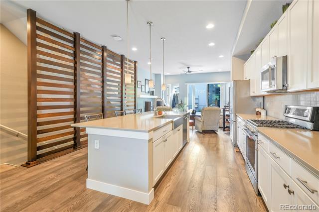 Live in the heart of one of Denver’s most vibrant neighborhoods in this beautifully designed, contemporary brownstone just blocks from the Denver Botanic Gardens and Cheesman Park. This spacious home offers a modern layout and incredible natural light. The main level features soaring ceilings, an open concept floor plan, and a designer kitchen with a large island, perfect for cooking, hosting, or enjoying everyday meals. The living room centers around a cozy gas fireplace and opens to a private outdoor patio through oversized sliding doors, powder room and convenient mudroom complete the first floor. Upstairs, the primary suite offers a peaceful retreat with a spacious closet and spa-like bathroom with soaking tub and large shower. A second bedroom and bathroom, along with a dedicated laundry room. The third floor provides a flexible bonus space with its own ¾ bath, large closet, and access to a rooftop deck. Ideal for a home office, guest space, workout room, or additional lounge. The finished basement adds even more living area with a family room featuring a custom wood accent wall, a wet bar with beverage fridge and dishwasher, plus an additional bedroom and ¾ bath. A detached two-car garage with alley access offers convenience and additional storage. Enjoy being steps from neighborhood cafés, restaurants, and parks—including the charming Secret Garden Café & Bar nearby. Townhouse MLS# 5840933