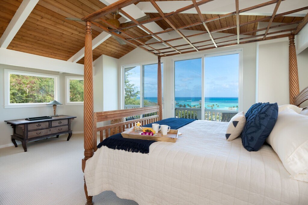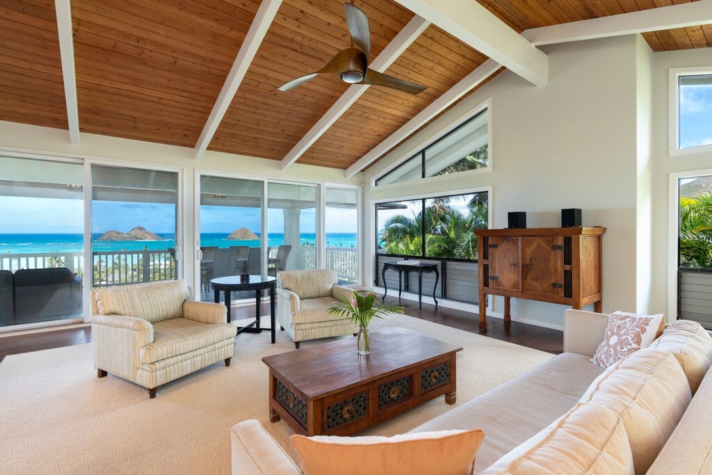 Come experience Makani Moana (Ocean Breeze). Set up on a hill in Lanikai overlooking the Mokulua Islands, this property boasts cool ocean breezes and unmatched views of the turquoise ocean below. Two expansive lanais provide endless opportunities to relax and whale watch, dine alfresco or have a cup of coffee and watch the sunrise. Situated at the end of a quiet lane, this property features lush tropical landscaping and ample indoor and outdoor living and dining areas. The ground level has a private outdoor shower with hot and cold water as well as a large, covered lanai, perfect for BBQs and getting those workouts in even when you are on vacation. Split AC units are located in every bedroom. A small set of stairs leads to the main floor of the home. This level features an open floor plan with a living room/kitchen/dining room that look straight out onto the vivid blue water below. Vaulted ceilings and comfortable furnishings make this a relaxing space that you are sure to enjoy. Professional and amateur chefs will have no trouble preparing meals in the bright, spacious and fully stocked kitchen. A media room, half bathroom and guest room with queen bed are also located on this floor. Upstairs you will find a master suite with en suite, private lanai and ocean view, a guest room with queen bed, a guest room with two twin beds and a full bathroom. Access to the ocean is a 10 minute walk and Lanikai beach and the popular Lanikai pillbox hike are 5 minutes by car. Kailua town is a short 10 minute drive away and features local shops, restaurants, farmer’s markets, microbreweries and beach equipment rentals. Bedroom Configuration: Guest Room 1- Large primary suite with 4 post King bed, ensuite bathroom with walk in shower and soaking tub. Guest Room 2- Queen bed, ensuite bathroom with dual sinks and walk in shower. Guest Room 3- Queen bed Guest Room 4- Two twin beds Appliances Included: Dishwasher, Dryer - Electric, Garbage Disposal, Microwave, Oven - Electric, Refrigerator, Stove - Electric, Washer/Dryer - In Unit This property is professionally managed by Private Homes Hawaii, LLC and is a legally established rental accommodation that is rented for periods of 30 consecutive days or more at any one time. It is compliant with Hawaii State Legislation (HB2078), License# TA--01. Property owner holds a Hawaii State General Excise Tax License. Available for 30-90 days at $12,000 per month plus GET and TAT. Pricing does vary by month. Includes electricity allowance, internet, cable, landscaping, water, sewer, and pest control. Sorry, no pets, no smoking and no subletting allowed. Contact Alia Chochol (RA) RS-84884 at for available dates.
