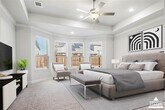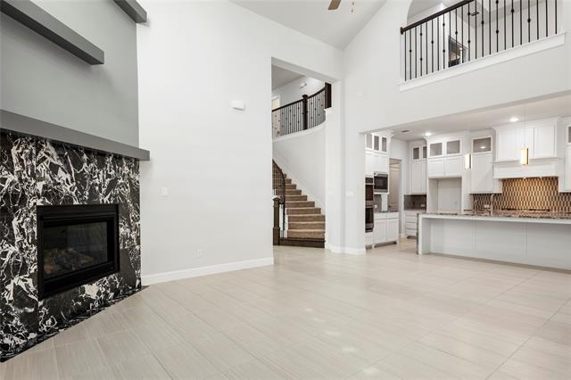 Exceptional 2021-built luxury home for lease in the sought-after Estates at Shaddock Park, Frisco ISD. This impressive 4,078 Sqft residence offers refined design, soaring ceilings, and a thoughtful floor plan ideal for both everyday living and entertaining. The dramatic two-story living room features a striking floor-to-ceiling marble-accent fireplace, custom floating shelves, expansive windows with designer shades, and abundant natural light. The open-concept layout flows seamlessly into a chef’s kitchen showcasing an oversized quartz island with waterfall, crisp white cabinetry extended to the ceiling, statement tile backsplash, gas cooktop, double ovens, walk-in pantry, and modern pendant lighting. The primary suite is a private retreat with a tray ceiling, sitting area, and spa-like bath offering dual vanities, soaking tub, separate shower, and a large walk-in closet. A dedicated home office and an additional downstairs bedroom with ensuite bath provide flexibility for work or guests. Upstairs features two additional ensuite bedrooms, a spacious loft, and a dedicated media room with tiered ceiling and wall sconces—perfect for movie nights or gaming. Enjoy outdoor living on the expansive covered patio overlooking a beautifully sized backyard, ideal for entertaining or relaxing. Additional highlights include designer lighting, neutral modern finishes, 3-car garage with an electric charging station, and energy-efficient features. Prime Frisco location on a large lot facing green space, near shopping, dining, parks, and major highways. Some photos are enhanced with virtual staging.