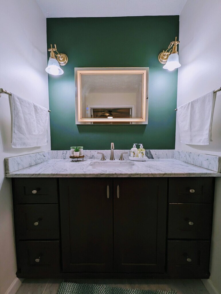 Welcome to this luxurious 5-bedroom, 4.5-bathroom retreat in Marietta, Georgia. With four king-size beds, a queen bed, and two sofa beds, this home is designed to meet diverse guest needs. Thoughtful amenities like large flat-screen TVs and a fully equipped kitchen ensure comfort and convenience. The property is a short drive from Marietta Square, Kennesaw Mountain National Park, and the Chattahoochee River. Although there are stairs to access this unit, once inside, it’s all on one level, offering a seamless living experience. Indulge in the comfort of spacious and thoughtfully designed bedrooms and bathrooms. This apartment boasts five bedrooms and 4.5 bathrooms, ensuring ample space for every guest. Each king-size bedroom features a sunroom with an office desk and chair, while the fifth bedroom offers a queen-size bed and additional workspace. The fully equipped kitchen includes modern appliances and cooking basics, perfect for preparing meals. Relax in the living room with an indoor fireplace and large flat-screen TV, or step outside to enjoy the private patio and garden views. The property features free parking on the premises and on-street parking for your convenience. Pets are not allowed, with a penalty of $500 per pet per night. Additional guests or visitors are not permitted without prior approval, with a penalty of $500 per person per night. Smoking is strictly prohibited, with a penalty of $500 per night booked. No events, parties, or large gatherings are allowed, with a penalty of $500 per person per night booked. Explore Atlanta from this Marietta home, conveniently located near charming Marietta Square, Kennesaw Mountain National Battlefield Park, and Kennesaw State University. Enjoy family-friendly attractions like Six Flags Whitewater and Six Flags Over Georgia, or cool off by tubing down the Chattahoochee River. Sports fans can catch games at SunTrust Park, Mercedes-Benz Stadium, and State Farm Arena. Nearby attractions include the Chattahoochee River National Recreation Area, The Big Chicken, and the Marietta/Cobb Museum of Art. Guests must be at least 21 years old to book, and a photo ID is required for check-in. Quiet hours are from 9 PM to 8 AM. The property is equipped with outdoor cameras, door and window sensors, and motion sensors for safety and security. Guests are responsible for any damage to the property during their stay and should report any damages to both the guest contact and booking channel partner. Each bedroom includes a dedicated workspace with a desk and chair, complemented by super-fast Wi-Fi, making it ideal for remote work. A laptop computer is not included. [SI]
