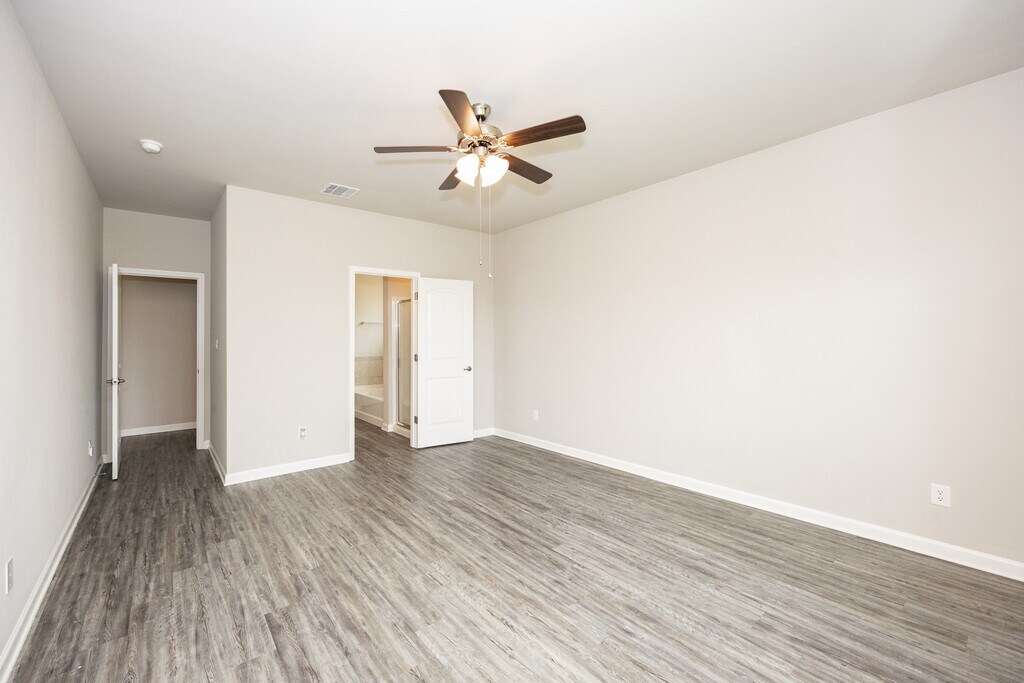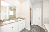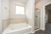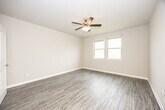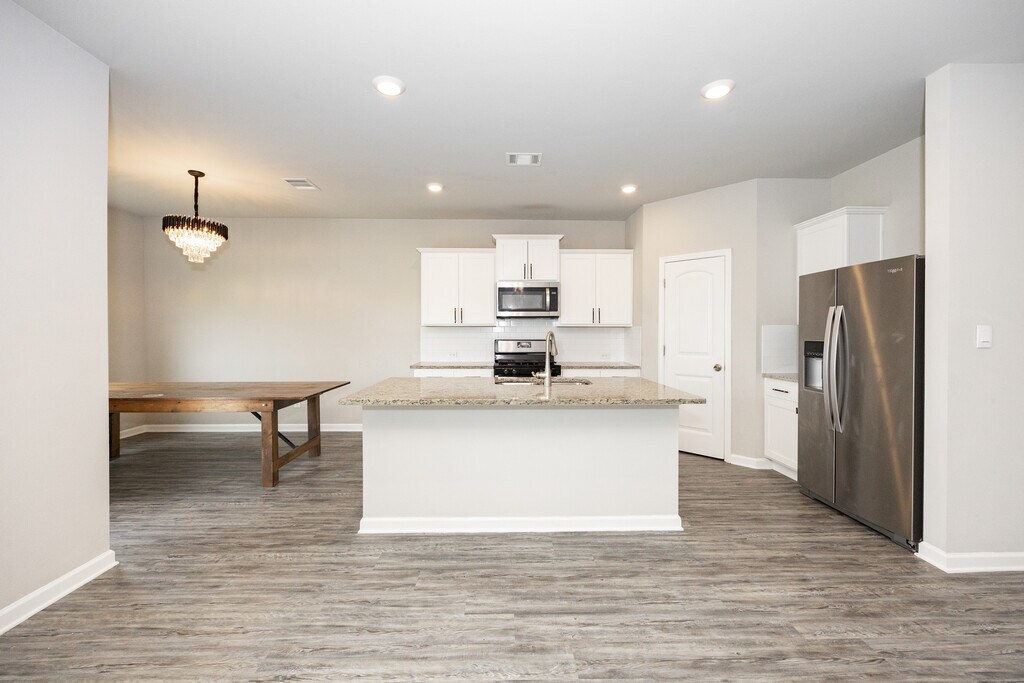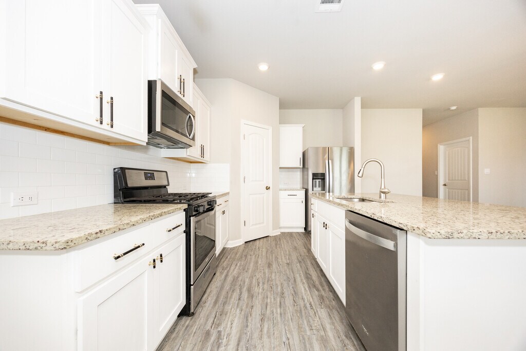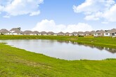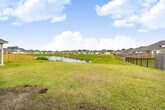 Split-floor plan on a waterfront lot with great neighborhood amenities. An open living/kitchen/breakfast layout draws your eye to a wall of windows that fills the space with natural light. The kitchen features granite countertops, stainless appliances (including a gas range), and a corner pantry. You’ll find 9-ft ceilings throughout- luxury vinyl plank flooring in the main living areas and primary bedroom, with carpet in the three guest rooms. The primary suite offers dual vanities, a separate shower, and a garden soaking tub. Three additional bedrooms share a full bath off the foyer, and garage access through the utility room adds everyday convenience. Community perks include a large swimming pool with splash area, playground, and picnic pavilion. Refrigerator, washer, and dryer remain. Some pets considered (max2) with a $400 non-refundable fee per pet plus $25/month per pet-