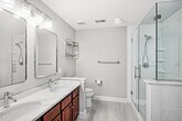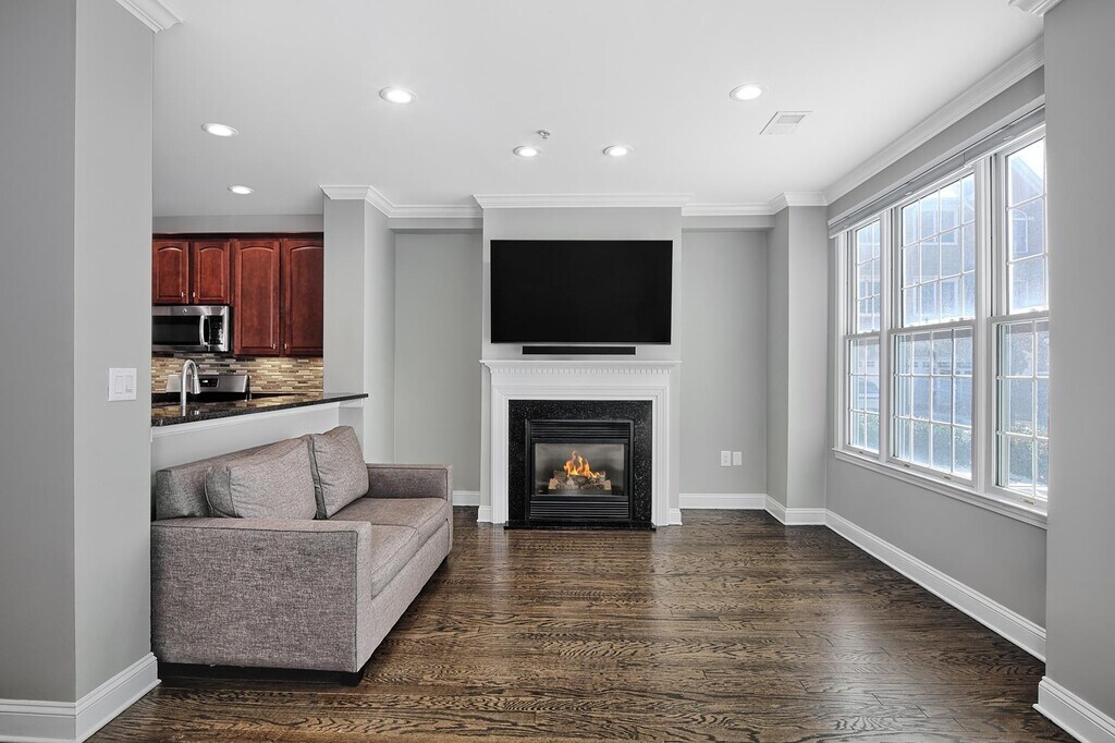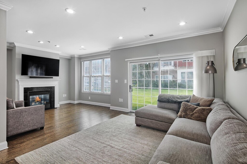 Experience refined living in this chic Bull’s Ferry–Bergen–style corner home, ideally situated on a quiet cul-de-sac. The open-concept living and dining area flows seamlessly to a private patio through a glass slider, creating an inviting space for everyday living and entertaining. A private balcony extends from the primary bedroom, offering an additional outdoor retreat. Interior features include hardwood floors, a pull-down TV mount above the fireplace, and a beautifully updated galley kitchen with granite countertops, a custom backsplash, garbage disposal and stainless steel appliances. Thoughtfully designed closet shelving enhances storage throughout the home. The primary bathroom has been elegantly renovated with a new shower, toilet, flooring, and a Calacatta Quartz countertop. All bathrooms feature new mirrors, lighting fixtures, and hardware. Additional upgrades include new blinds on every window, updated electrical outlets and switches, and freshly painted doors with modern hardware. Smart-home enhancements include a Google Nest thermostat and Alexa-enabled light switches. Parking accommodates two vehicles—one in a private garage equipped with storage shelving and an EV charger, and one in the driveway. This sought-after community offers exceptional amenities, including two pools with Jacuzzis, a tot lot, and a complimentary shuttle to the NY Waterway ferry. The 158 bus to NYC is just steps away, and the home is conveniently close to restaurants and shopping. This is an opportunity not to be missed.