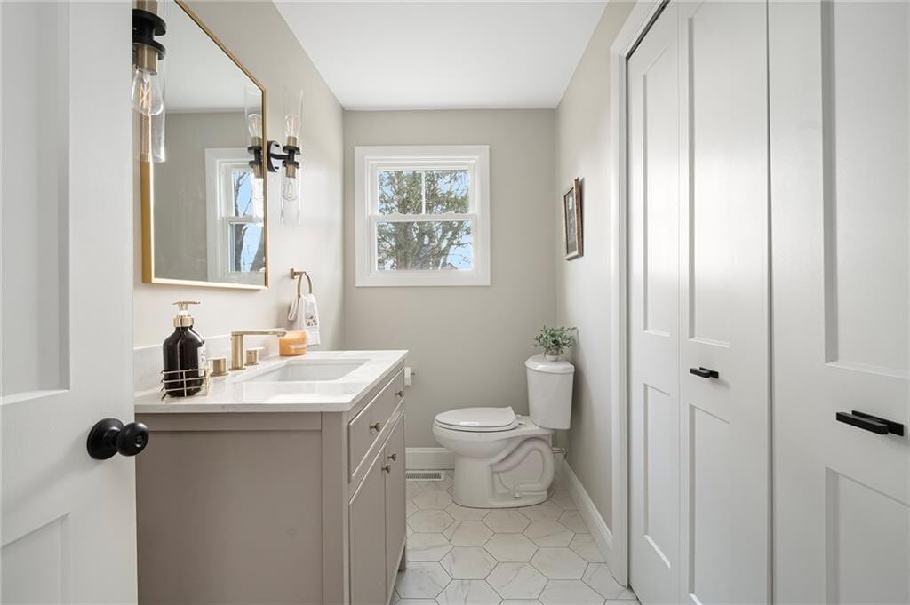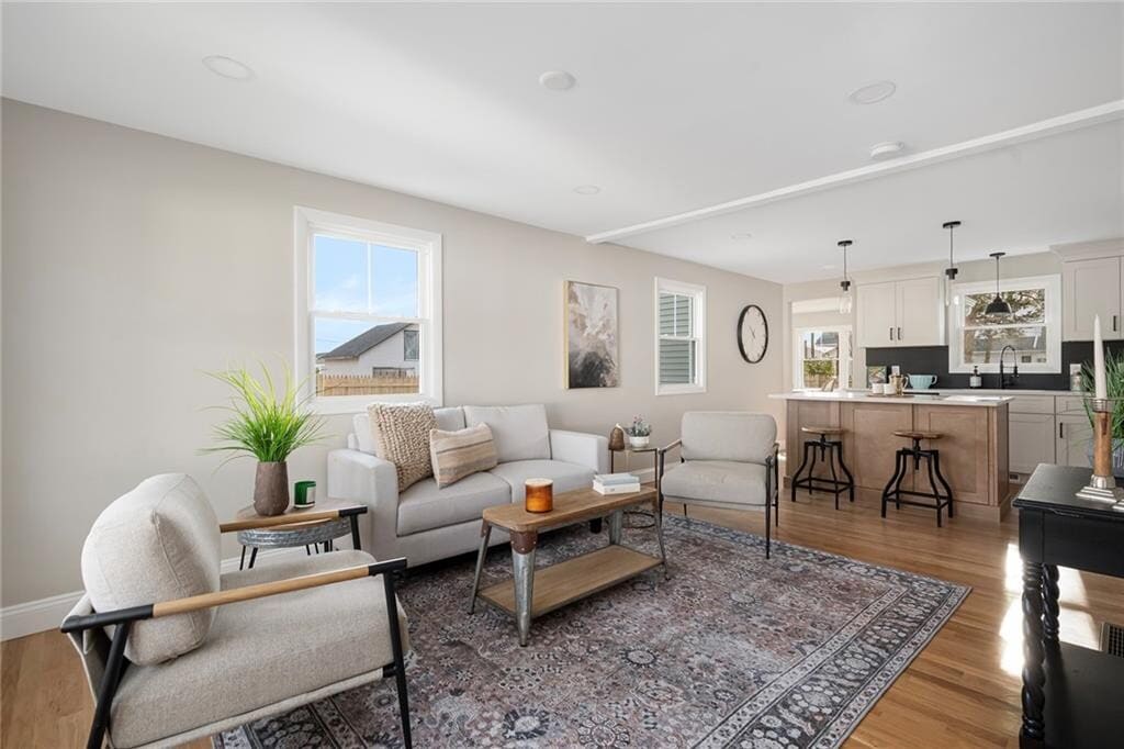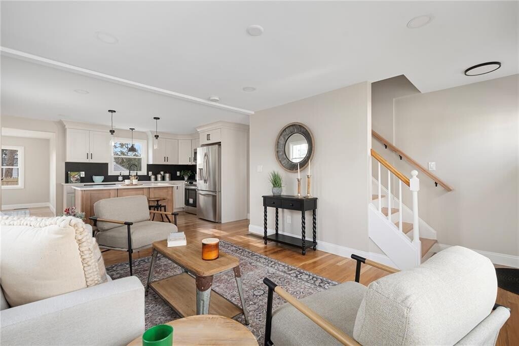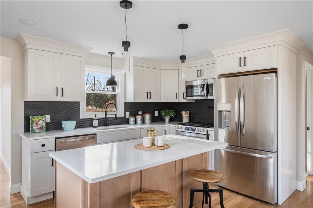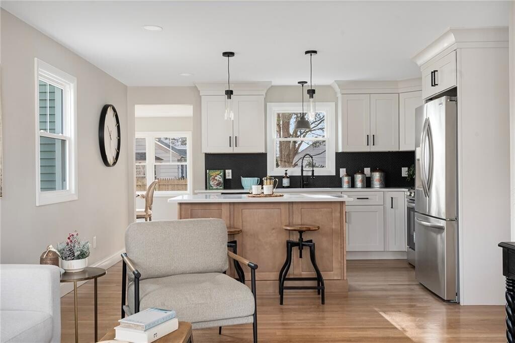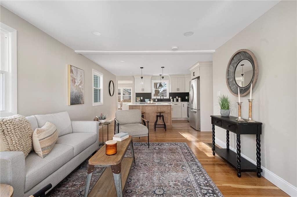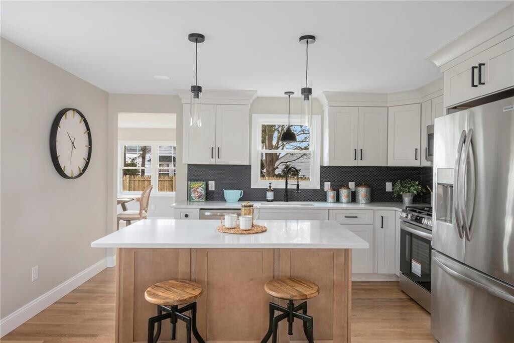 Available as a yearly rental,or longer. Walk to the beach from this immaculately renovated 3-bedroom,2.5-bath Cape located in the hidden gem neighborhood of Mount View in North Kingstown. Enjoy water views,beach access just a short stroll away,with Calf Pasture Nature Trails and the Quonset Bike Path nearby. The main level offers highly desirable one-level living with an open floor plan connecting the kitchen,dining area,and living room—ideal for everyday living and entertaining. The heart of the home is a stunning gourmet kitchen featuring white quartz countertops,stainless steel appliances,a large center island,and ample cabinetry. Hardwood floors extend throughout the first floor,leading to a convenient half bath,laundry room,and a spacious primary suite with ensuite bath,double vanity,tiled walk-in shower,and generous walk-in closet. The second floor includes two comfortable bedrooms and a beautifully updated full bath with tub/shower combination. Ideally located just 1.5 miles from Quidnessett Country Club,this home offers the perfect blend of coastal living and convenience. A rare opportunity to be the first tenant in this beautifully updated home in a sought-after seaside neighborhood. Tenant responsible for all utilities,pets negotiable. MLS ID 1404323
