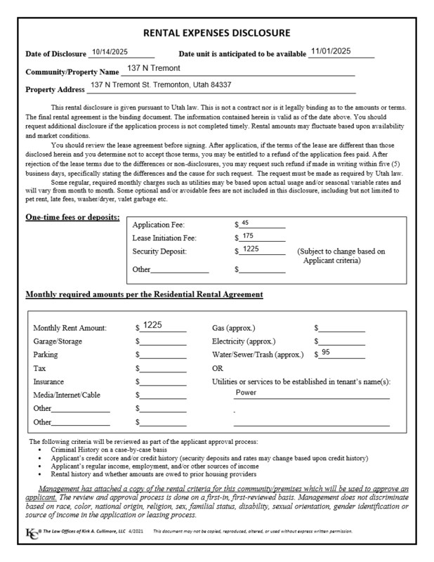 This charming main-level duplex offers 2 spacious bedrooms and 1 full bathroom. Enjoy the convenience of an in-unit laundry area and a detached 1-car garage. Utilities: Water, sewer, and garbage are a flat rate of $95, paid directly to Capener and Company. All other utilities are separate and are the responsibility of the renters. Pet/Smoking Policy: No Pets. No Smoking. No Vaping Fees: Application Fee: $45 per adult (18+) Lease Initiation Fee: $175 Application Process: To apply, please fill out an application through our website: The $45 application fee per adult will not be charged until you are first in line and have approved the fee. Note: The price shown is base rent and may not include non-optional fees and utilities. Prices and availability are subject to change without notice. Square footage definitions may vary. Displayed square footage is approximate.
