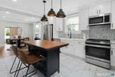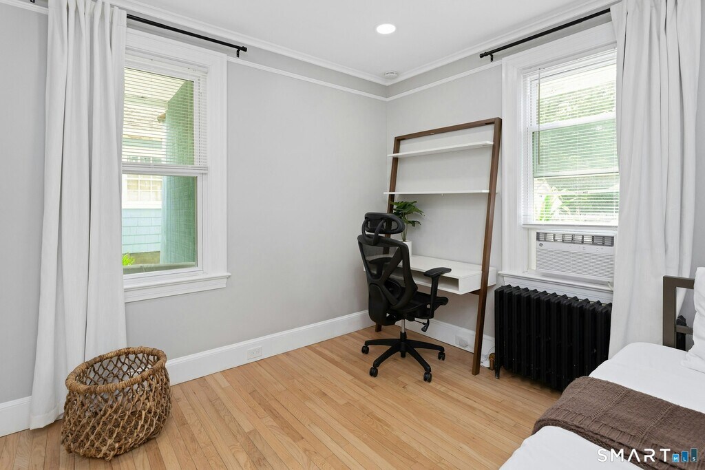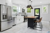 Call for Availability - This beautifully updated 2-bedroom, 1-bath residence seamlessly blends timeless architectural character with refined modern finishes. Rich hardwood floors, soaring ceilings, recessed lighting, and elegant curved archways create warmth and sophistication throughout. The spacious living room flows effortlessly into a sun-drenched sunroom lined with oversized windows-an ideal space for a home office, reading lounge, or creative studio. A dedicated dining area connects seamlessly to the renovated kitchen, thoughtfully designed with stainless steel appliances, a farmhouse sink, center island, and designer tile backsplash-perfect for both everyday living and entertaining. The generously sized primary bedroom is filled with natural light and highlighted by a striking accent wall, while the second bedroom offers custom built-in shelving for added functionality and style. The refreshed bathroom features dual vanities, sleek contemporary fixtures, and a jetted soaking tub for a spa-inspired retreat. For added convenience, the unit includes an in-unit washer and dryer. Outside, enjoy access to a shared yard framed by mature privacy trees-an inviting setting to relax and unwind. Ideally located within walking distance to the Glenbrook Train Station and just minutes to Downtown Stamford's renowned dining, shopping, and entertainment, this home offers the perfect balance of charm, comfort, and convenience. MLS# 24151966