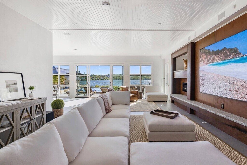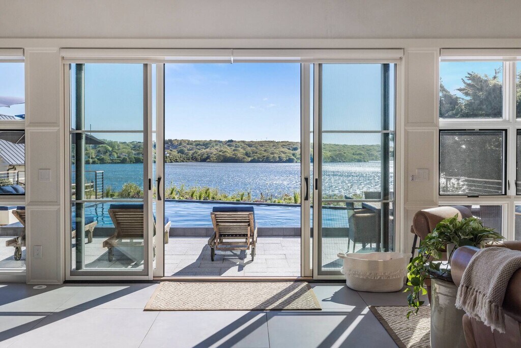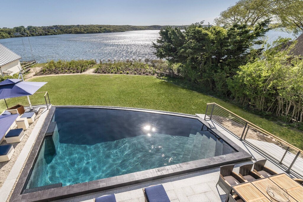 Also Available: June '24 $30k, New Waterfront Modern Barn style home with incredible western facing sunset views across Fort Pond. Offering open floor plan with expansive living room, dining area, and top of the line chef's kitchen with Gaggenau appliances, all with dramatic water views. French doors off the living room open to the patio with retractable awning and infinity edge heated gunite pool. Steps lead down to small dock with easy access to launch a kayak or stand up paddle board for a pond cruise. Rental amenities include sauna, cold plunge, outdoor BBQ, luxury massage chair, LED large screen TV's. Convenient location provides easy access to the beaches, village, and docks. [[Rental Registration # Pending]] Rental Terms: August - Labor Day: $82,005 Other / Short Term - Year Round: $200,000