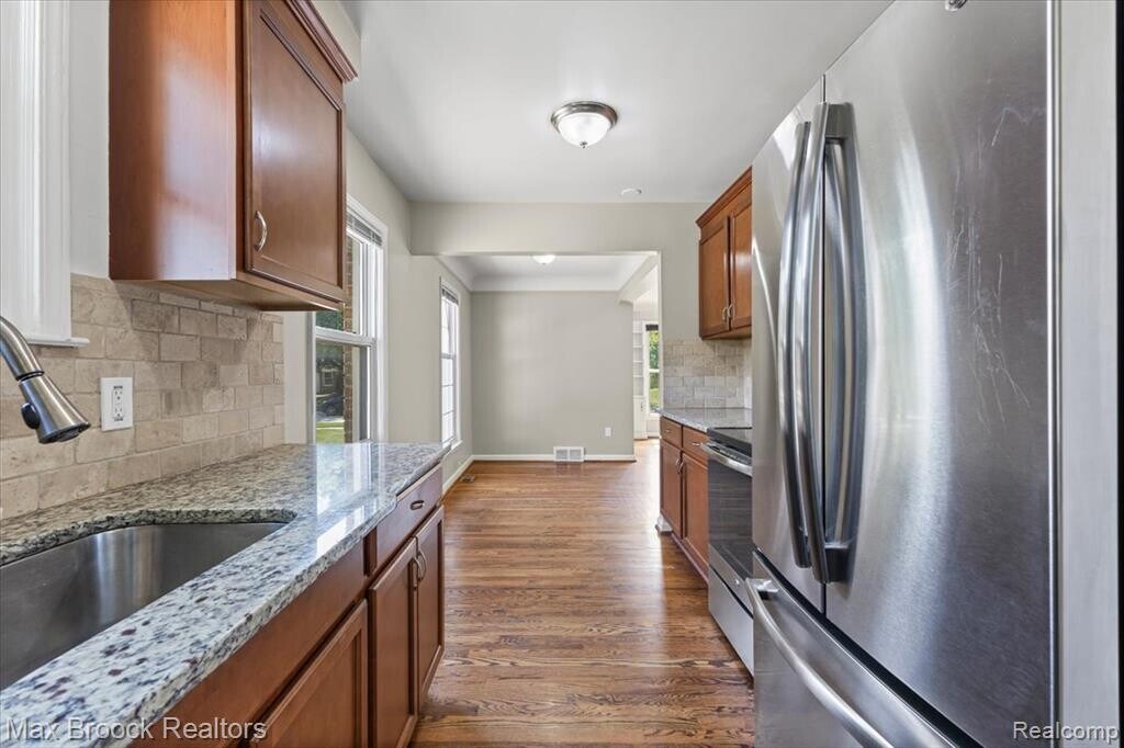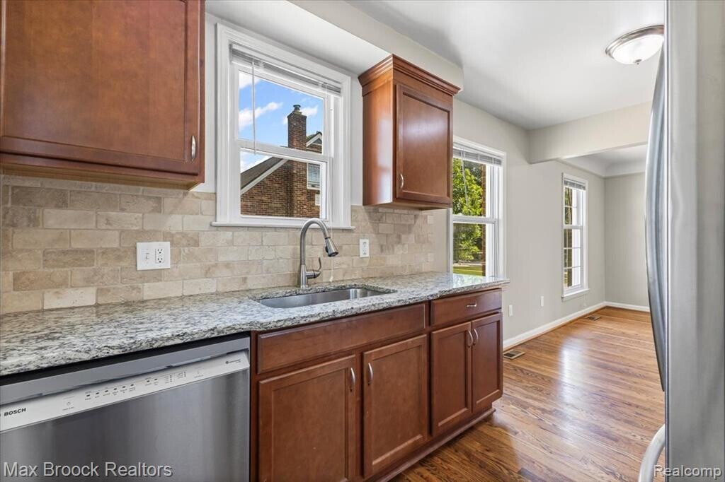 Beautifully updated bungalow on a quiet, tree-lined street in the Berkley School District. The inviting covered porch opens to a spacious living room with refinished hardwood floors, coved ceilings, and a large picture window with original built-ins. Hardwood continues through the main level and bedrooms. The updated kitchen features newer cabinets, granite counters, ceramic backsplash, and stainless appliances, plus a generous dining area. Two main floor bedrooms offer neutral decor and natural light, along with an updated full bath. Upstairs are two more large bedrooms with newer carpet. The spotless basement offers excellent storage. Outside, enjoy a private backyard with patio and oversized 2-car garage. Numerous updates throughout. Close to downtown, restaurants, major roadways, and several places of worship. Just one block from Peasley Park!