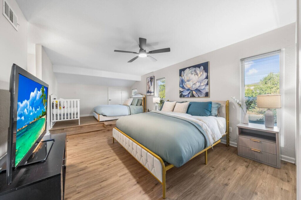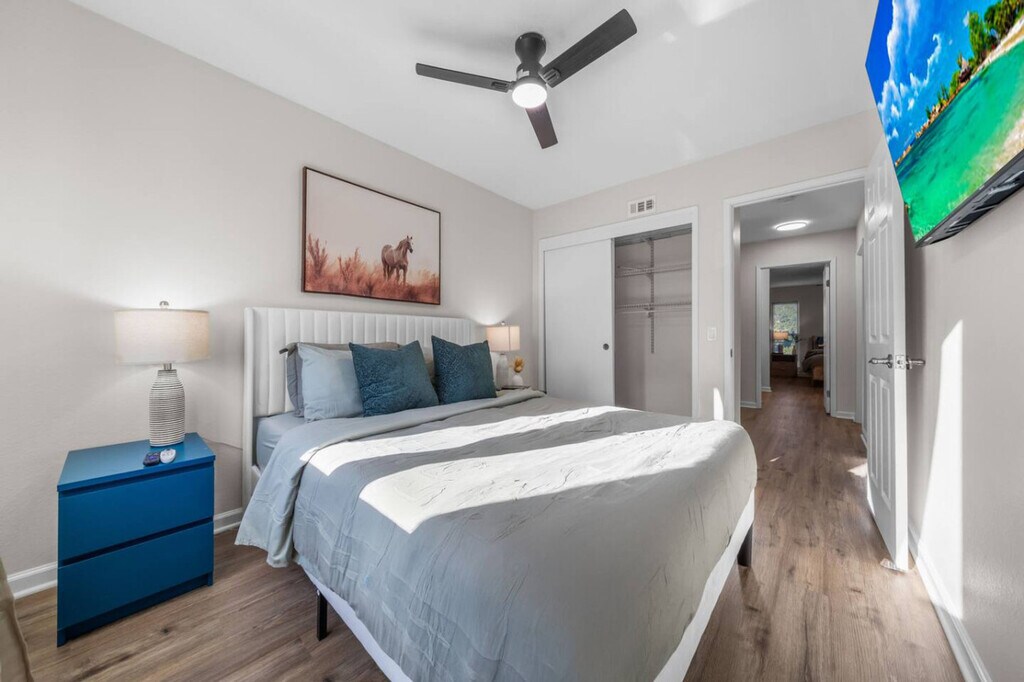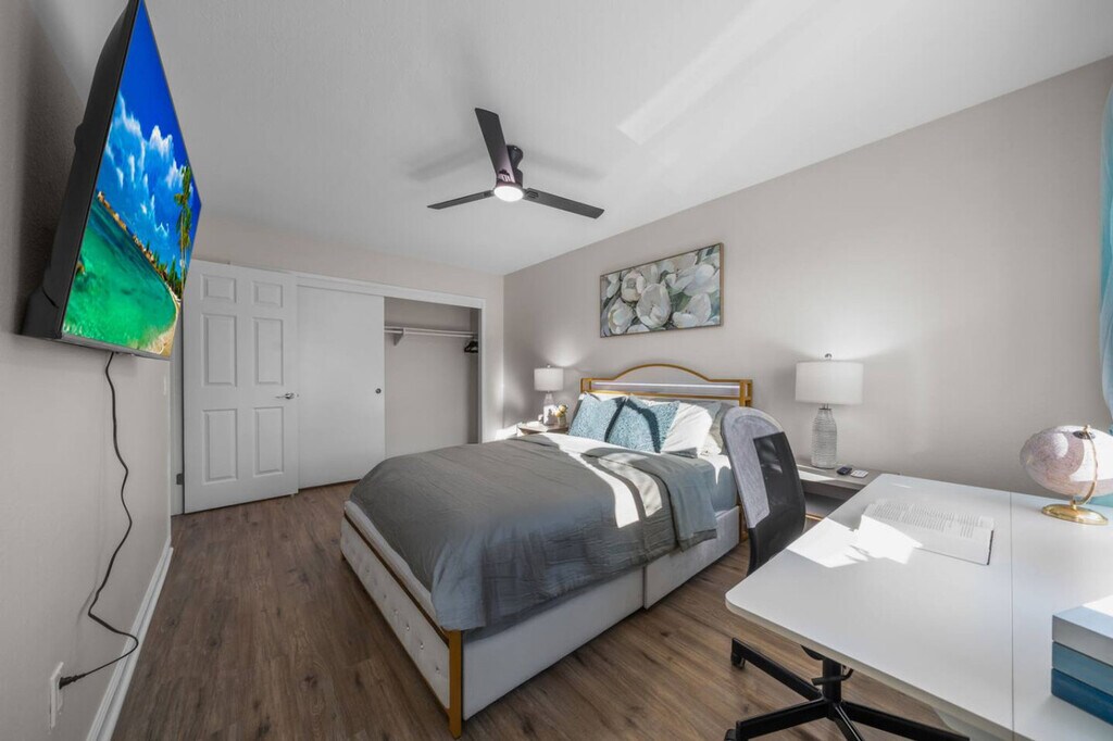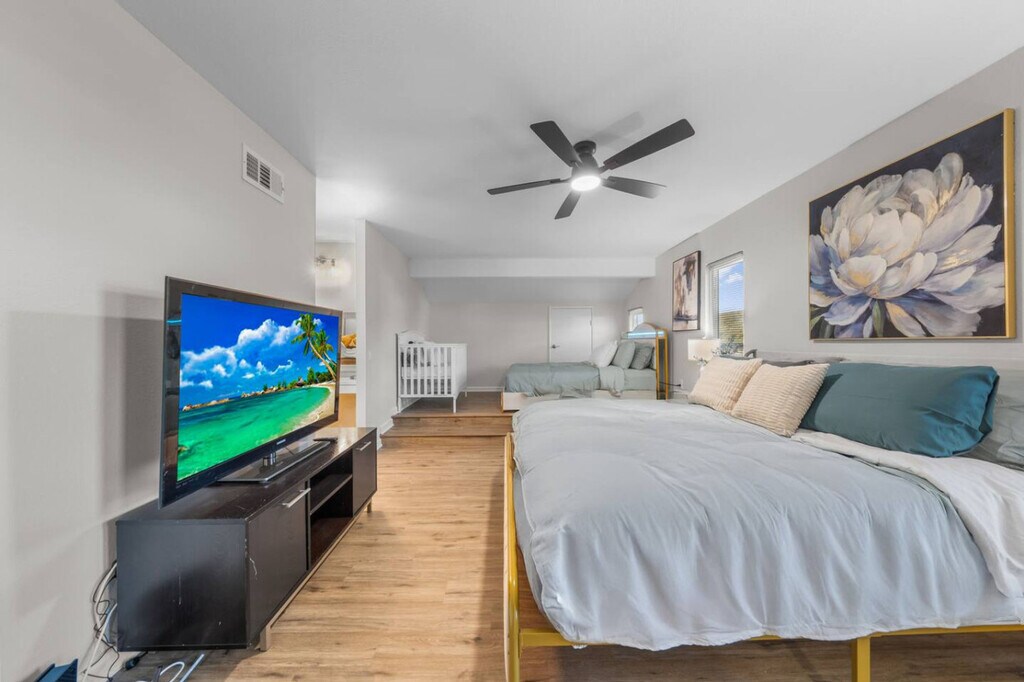 Welcome to this family home in San Diego! Feel at home in this entire home, which features a king-size bed and access to a spacious backyard with a pool. The centrally air-conditioned living room features a 75-inch flat-screen TV with cable and Roku for streaming services, plus an Xbox game console. The kitchen is equipped with modern appliances and essentials like coffee, cooking oil, sugar, and salt. The bathrooms are fully stocked with shampoo, body wash, a hairdryer, and fresh towels. An in-unit washer, dryer, and detergent are available for your convenience. Pets are allowed. RV sewer hookup is available in the driveway. Driveway parking is available. Located in the vibrant and family-friendly Rancho Peñasquitos, Mira Mesa area, this home offers quick access to major freeways (I-15 and I-805), making it easy to reach downtown San Diego, La Jolla, beaches, Disneyland, or Mexico. You're also only 20–25 minutes from the beaches of Torrey Pines, La Jolla Shores, and Pacific Beach, and less than 30 minutes from San Diego International Airport. Enjoy a variety of nearby shopping centers and restaurants with Asian, Mexican, American, and European cuisine. Please keep noise to a low level at all times, and after 9 PM, all activities must move indoors with windows and doors closed to avoid disturbing neighbors. Excessive noise may lead to neighbor complaints or visits from local authorities, and a $1,000 violation fee may apply, as it could risk the suspension of the listing or your account. Each unauthorized guest or pet may incur a $100 per person/pet per day/night fee. Tampering or disconnecting security camera, noise monitor, or other security devices will result in a $1000 fine. A minimum fee of $100 may be applied to key-related issues such as forgetting to return keys after checkout, lost keys, locking yourself out and requiring us to travel to bring spare keys, or key replacements, etc. If your dogs bark or potentially make loud noise when they are alone at the house, please bring them with you or place them somewhere quiet to avoid neighbor complaints. Garage access is unavailable today. Fast 5G AT&T Wi-Fi is available, easily fast enough to host an online meeting or share a large file with clients or colleagues. A choice of desks and chairs are available inside and outside. Please follow common-sense shared pool etiquette as if you are in a public pool. [SI]