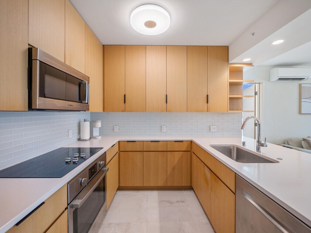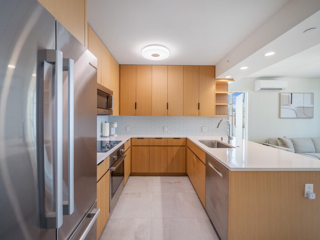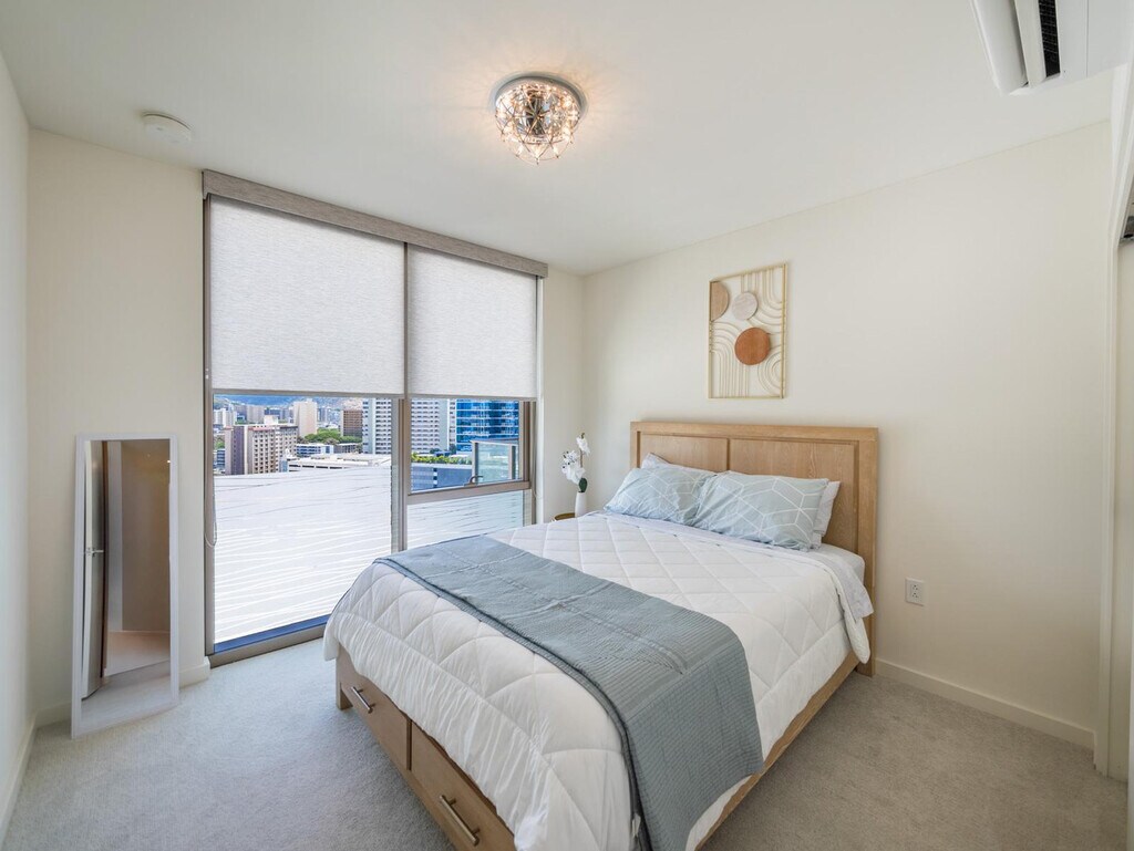 Feel at home in this beautifully appointed condo located in Sky Ala Moana, one of Honolulu’s newest luxury residences, situated on the 15th floor. This unit offers sweeping city, mountain, and Punchbowl views. This condo features a modern, fully equipped kitchen and spacious living areas. The full-size kitchen includes a refrigerator, stove/oven, dishwasher, microwave, rice cooker, blender, and Keurig coffeemaker. You'll also find a full-size front-load washer and dryer in the hallway closet. Linens, bath towels, dishes, silverware, and cookware are provided. A starter kit with paper towel, toilet paper, 1oz shampoo, 1oz conditioner, bath soap, hand soap and liquid dish soap is included. One assigned parking spot is included. Perfectly situated between world-renowned Waikiki and the vibrant Ala Moana district, you’ll enjoy easy access to Ala Moana Beach Park, Ala Moana Center, and an endless selection of dining, shopping, and entertainment. Check-in is at 3 p.m. and check-out is at 11 a.m. To guarantee a late check-out, you must reserve the condo for the night of your departure. Condiments/spices, coffee, detergent, beach chairs/umbrellas/toys, or a cooler are not provided. The primary bedroom includes a work desk. Registration Number: TA--01 [SI]