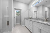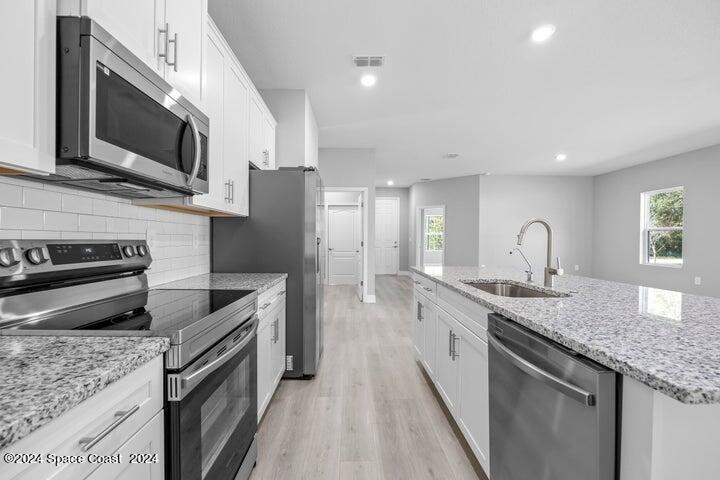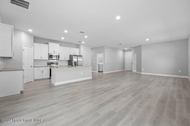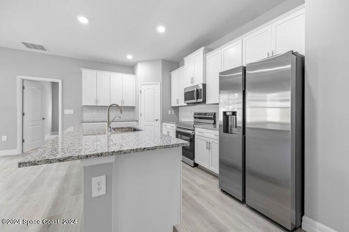 This modern home in Palm Bay boasts four spacious bedrooms and three sleek bathrooms,designed for comfort and style. The exterior features a clean,minimalist design with large windows,offering plenty of natural light. Inside,the open-concept living area flows seamlessly with Movhawk revwood floors into a oversized kitchen equipped with high-end stainless steel appliances,granite countertops,and a large island. The master suite includes a luxurious ensuite bathroom with a walk-in shower,his and her closets,and double sinks. Each additional bedroom offers ample space,with a sense of comfort. A two-car garage and modern finishes throughout add to the appeal of this beautiful Palm Bay residence. Close to Bayside Lakes and local shopping. Lawn care is included.