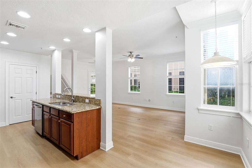 Location,Location,Location in Baldwin Park right by New Broad and Publix! 3 bedroom townhouse WITH A TWO CAR GARAGE! The whole townhouse has just been completely renovated,so fresh and clean throughout. This open concept layout has a beautiful open kitchen with rich dark cherry cabinets and classic granite countertops. It has a built in breakfast area for a stools,stainless steel appliances,and a huge pantry. Between the built in desk,21 cabinets,and the huge pantry there are tons of storage space in the kitchen. Downstairs is wide open for a huge living room or a living room/family room/Dining room combination. On the first floor you can also enjoy an extra breakfast nook area. High end Luxury vinyl throughout takes you up the steps to the 3 bedrooms and a large master suite with two walk in closets. The upstairs has very tall ceilings making it feel even larger that this great townhouse is. The master suite includes walk in closets,soaking tub,shower,and dual sinks. Two additional large bedrooms each have walk in closets and share the peaceful balcony overlooking a quiet street. The layout features a laundry room upstairs for your convenience. Included with the lease is access to both Baldwin Park fitness centers,community clubs,and pools! Grab your groceries across the street at Publix. Only 2 blocks away from all the restaurants,the brewery,and conveniences of downtown Baldwin Park. Close to the lake and all the walking and running trails around Lake Baldwin. WATER,SEWER,TRASH Utilites included in the rent. with the lease is access to both Baldwin Park fitness centers,community clubs,and pools. Come check out this beautiful townhome in the heart of one of the most sought after neighborhoods in Orlando. MLS# O6372974