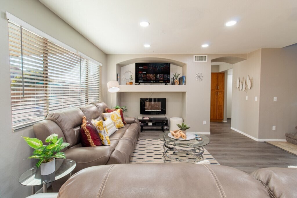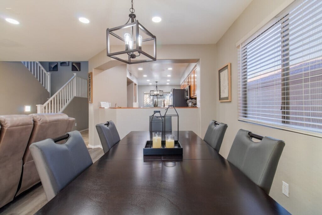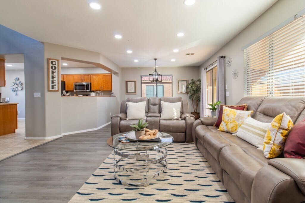 Escape to this stunning 4-bedroom retreat in Casa Grande, where you can feel at home with a heated pool, cozy firepit, and private yard—ideal for families and groups. The primary suite offers a king-size bed with an en-suite bath, complemented by two queen bedrooms and a bunk room, providing ample space for everyone. Relax in the open-concept living area, cook in the fully equipped kitchen, and unwind by the pool. This home blends comfort and relaxation perfectly, offering everything you need for a memorable stay. The fully equipped kitchen comes with essentials and extra conveniences like a blender, wine glasses, and BBQ utensils. The open-concept living and dining area is perfect for group gatherings, and you can enjoy entertainment on the smart HDTV with Prime Video, Netflix, Disney+, and Fire TV. High-speed Wi-Fi, board games, books, and children's toys are also available. Pool heat is provided free of charge and set to 85°F. The system cannot support temperatures above this, and the pool may not stay warm during colder nights as heat may escape overnight. Nestled in a peaceful neighborhood yet close to all the action, this home is just minutes from top attractions. Enjoy shopping at Promenade at Casa Grande, Casa Grande Mall, and Downtown Casa Grande. Explore attractions like Casa Grande Ruins, Pinal County Historical Museum, and Casa Grande Neon Sign Park. Nearby restaurants include BeDillon's, Big House Café, Anaya's Mexican, and Hideout Steakhouse. With easy access to major highways, you can take quick trips to Phoenix, Tucson, and beyond. The home features a private entrance and is equipped with smoke and carbon monoxide alarms and a first aid kit for safety. Enjoy comfort with heating, A/C, ceiling fans, and room-darkening shades for restful sleep. Washer and dryer with detergent, fresh towels, bed linens, and extra pillows are provided.