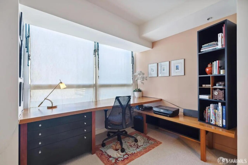 Set on the 12th floor, this rare corner residence at 1388 Gough offers privacy, abundant light, and sweeping north- and west-facing city views through floor-to-ceiling windows. One of the largest two-bedroom layouts in the building, Unit 1201 is peacefully situated on a quiet floor with just three homes, creating a calm retreat above the city. The spacious living and dining area is framed by expansive windows and hardwood floors, while the remodeled kitchen features custom cabinetry and stainless steel appliances. The large primary suite includes a renovated ensuite bathroom with dual vanity, and the second bedroomcurrently styled as a home officeoffers flexibility for guests or additional living space. A second updated bath and in-unit stacked washer/dryer complete the home. One-car parking is included. Full-service building amenities include 24/7 concierge and security, secure package receiving, elevator, a fitness center, guest parking, and a peaceful rear garden. Ideally located between downtown, Hayes Valley, Pacific Heights, Fillmore, and Japantown. Offered unfurnished or fully furnished, this turnkey residence is ready for immediate move-in.