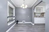 Welcome to this charming bungalow offering a comfortable and functional living space. The home features a bright living area with beautiful hardwood floors and convenient coat and hallway closets for added storage. The dining area flows seamlessly,creating a great space for everyday living and gatherings. The kitchen is designed with practicality in mind,featuring durable flooring,a stylish faux granite countertop,and a tile backsplash that adds a modern touch. The bathroom is clean and well-finished,with easy-to-maintain flooring and a ceramic tub surround. Each bedroom provides a comfortable retreat with soft carpeting and nicely sized closets,offering both warmth and storage. Step outside to enjoy a fully fenced yard,perfect for relaxing,entertaining,or outdoor activities. Dont miss out on this great opportunity!