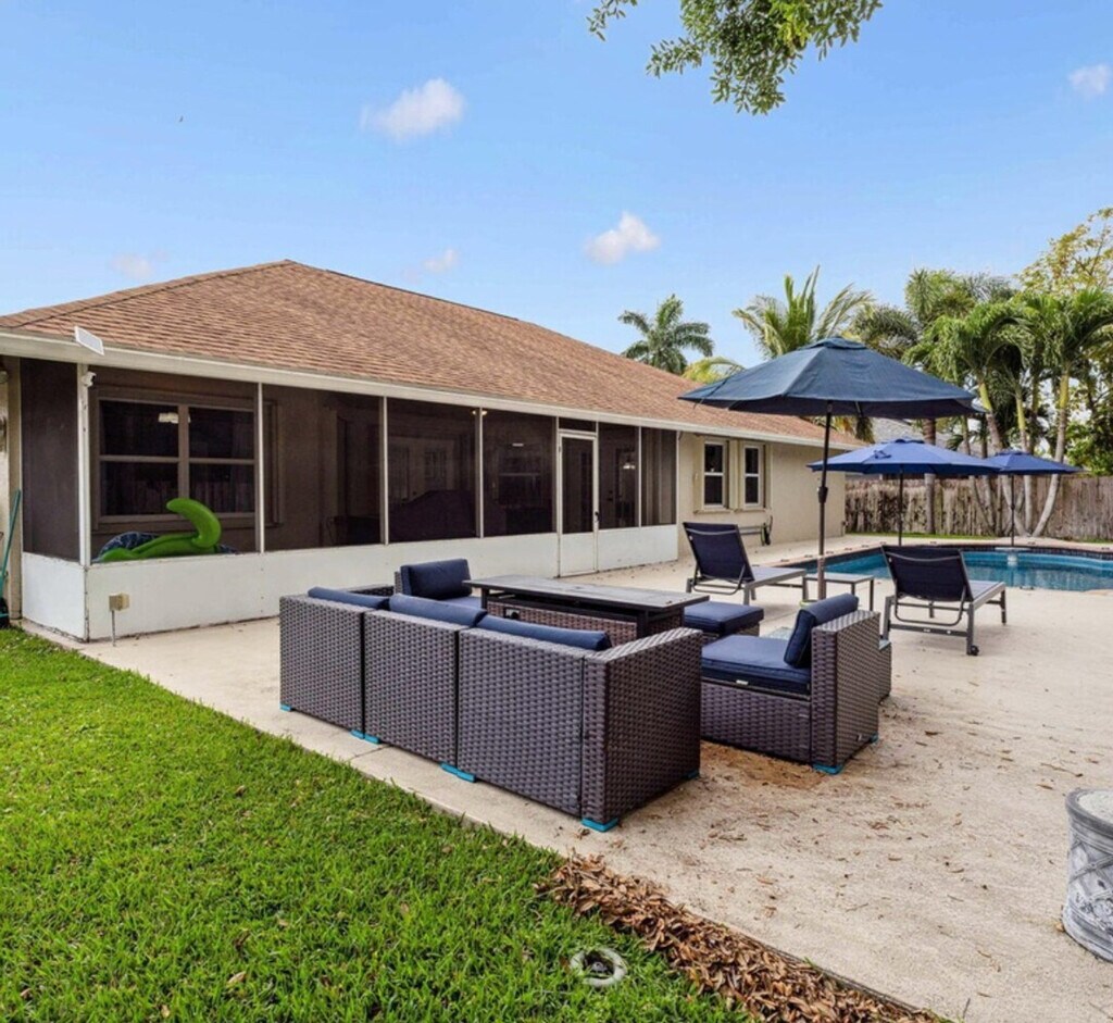 Welcome to Casa Cavallo, a spacious 4-bedroom, 2-bathroom home located in Wellington. This property features an open floor plan that receives plenty of natural light and includes a large, private heated pool for your enjoyment. Situated near the Palm Beach Polo Club, the International Equestrian Center, and Adequan Global Dressage Festival, you're also just 25-30 minutes away from downtown West Palm Beach, public golf courses, beaches, acclaimed restaurants, attractions, and yearly events. This tropical house in Wellington is perfectly located for relaxation and offers everything you need to get away from it all. The home is large and spacious, stocked with everything you need for both indoor and outdoor activities. The backyard is fully fenced for privacy and includes a pool with a safety gate, an 8-burner grill, and a seating area with a fire pit. Inside, you'll find a fully stocked kitchen, two dining areas, a comfortable living room with a large smart TV, and a game room with a pool table and darts. Located in Wellington, Casa Cavallo is near major attractions for equestrians, locals, and tourists alike. You're close to the Palm Beach Polo Club, the International Equestrian Center, and Adequan Global Dressage Festival. Downtown West Palm Beach, with its public golf courses, beaches, acclaimed restaurants, and attractions, is just a 25-30 minute drive away. Guests will have full access to the home except for a few locked storage closets for supplies. Entry instructions will be provided via our message thread. Landscapers access the property once a week to maintain the green space, and the pool cleaner comes on a set weekly schedule, entering through the side gate to minimize disturbance. Registration Number: 000032544, [SI]