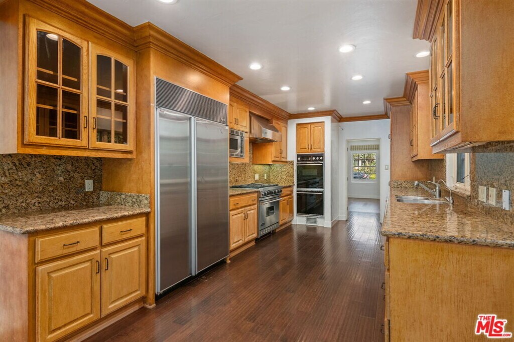 Updated Spanish home in prime Brentwood Flats location. This charming remodeled home features four generously-sized bedrooms and 3.5 baths. Many of the original detailing still intact. Hardwood floors, arched windows and doorways, gorgeous moldings and built ins add a nice sense of style against the backdrop of many modern conveniences.. Formal entry leads to the very spacious living room complete with a beautiful fireplace. The amply sized formal dining room provides easy access to the modern and upgraded gourmet kitchen equipped with stainless steel appliance. The family room with yet another fireplace opens seamlessly to the kitchen and also out through French doors to the beautifully landscaped backyard. A powder room, laundry room and a downstairs bedroom and bath complete the first level floor plan. Upstairs, the primary suite features a sitting area, a balcony, a walk-in closet and a spa-like bathroom. Two other secondary bedrooms share a bath, Jack and Jill style. Out back, there's a lovely deck space for easy al fresco lounging and dining, a refreshing pool and spa and a grassy area. the converted garage functions as a bonus room in the back yard. Air conditioning is upstairs only. Views of the pool and backyard from the master suite and family room. Square footage number is from an appraisal and is not guaranteed MLS# 25612717