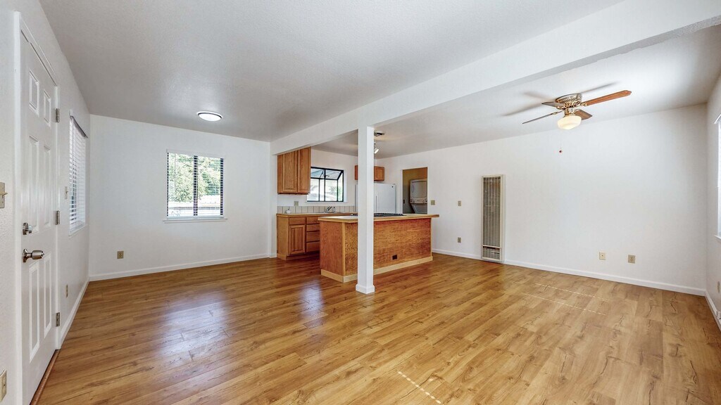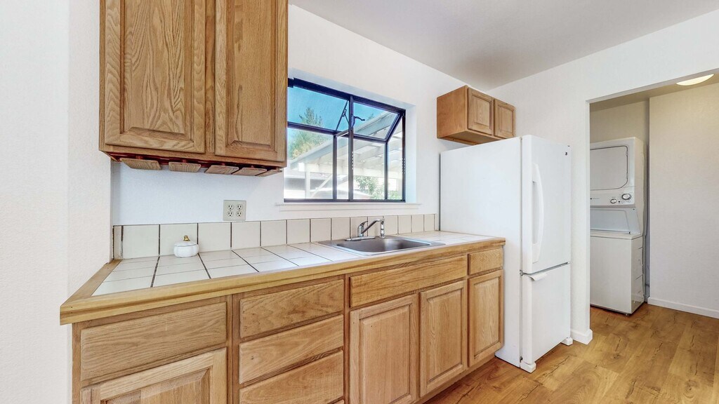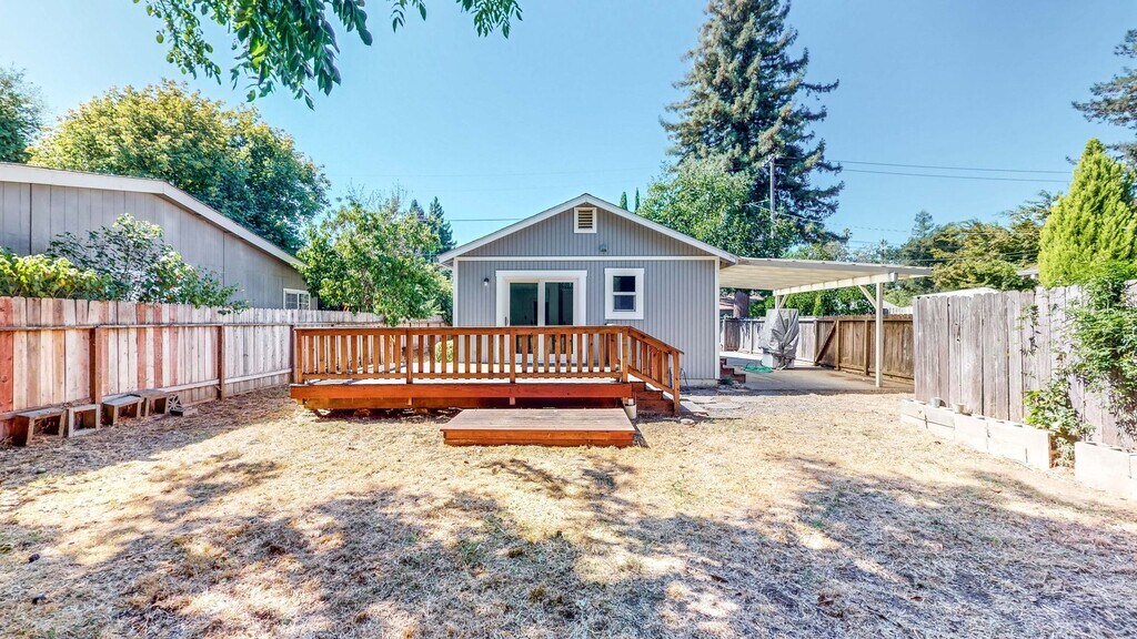 Charming 1 bedroom 1 bath Single Family home in Healdsburg! Water included! As you enter this home you are greeted by a Living room dining combo area off the Kitchen which includes a gas stove and oven, Refrigerator and Tiled Countertops. There is a Laundry area with a stacked washer and dryer. The Spacious bedroom provides access to a large back deck and large enclosed back yard. The bathroom has a walk-in shower. This home sits in the middle of the lot and has spacious yards all around. The property has a concrete driveway through the front gate with the option of parking inside the property in the covered carport. Wall heating. Sorry, no pets. Emotional support and service animals welcome! *12 month lease *Placement *JH