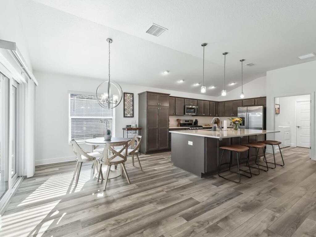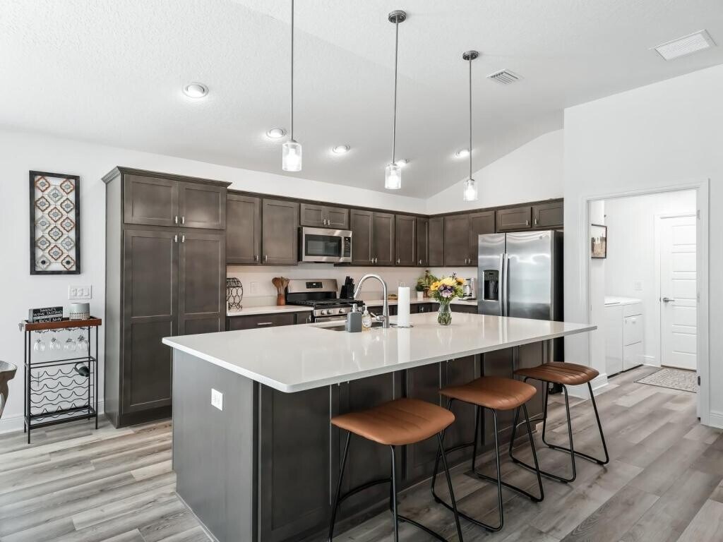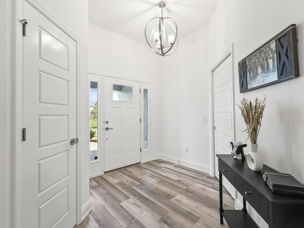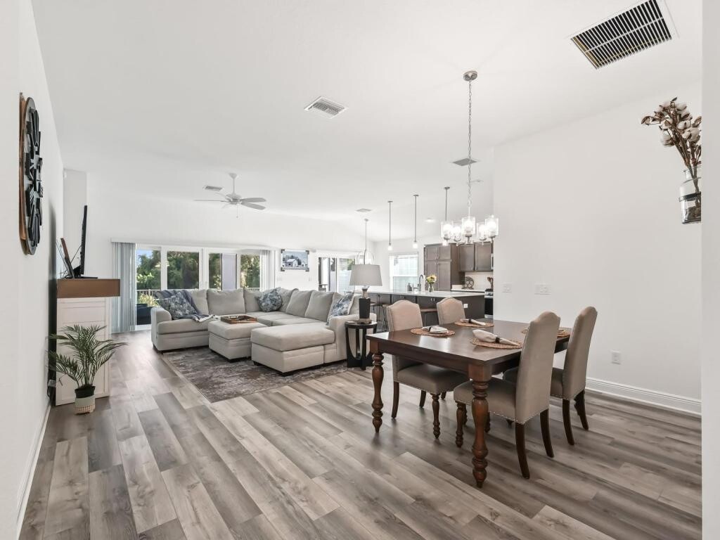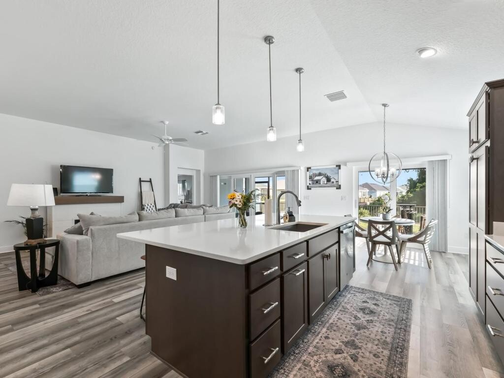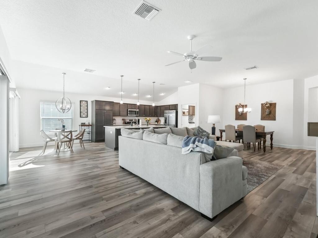 DYMANITE LOCATION! ABSOLUTELY GORGEOUS Veranda HOME in The Village of Lake Denham! This WATERFRONT ENTRY HOME is nestled on an oversized homesite backing up to the PRESERVE, providing you with all the beauty, serenity and privacy this location has to offer. Boasting an attractive front elevation; architectural details, gable rooflines, perfectly manicured yard and pleasing color palette. Step inside the glass entry door that is balanced with matching glass sidelights, you are welcomed into the foyer, the extended foyer hallway houses a coast closet, the luxury vinyl plank flooring that flows throughout the home and the neutral interior finishes are complimented by the hand troweled textured finishes on the walls and ceiling. The luxury kitchen boasts functionality and elegance offered by the warm rich tones of the cabinetry, cabinet pantry, crown molding, quartz countertops, island with large single kitchen sink, disposal, stainless steel appliances, recess and pendant lighting and a naturally lighted eat-in breakfast nook with sliding glass doors leading out the the lanai. This open and spacious layout offers you soft and cozy furnishings in the living with a large sectional, decorative electric fireplace and a generous sized dining room. The inside laundry is located off of the kitchen with washer, dryer and cabinetry for additional storage, and leads to the double car gar with cart garage. The primary bedroom is located in the rear of the home with large windows for a great view out to the preserve, king size bed with upholstered headboard, accent chairs, and a tray ceiling. The primary bathroom has been tastefully appointed with plenty of warm toned cabinetry with tons of storage, quartz countertops, double vanities, private commode, large tiled walk-in shower with glass panels and enormous walk-in closet. The two guest bedrooms are located toward the front of the home sharing the guest bathroom with a tub/shower combination. Additional features include; various ceiling fans, double pane insulated windows, stacking sliding glass doors that lead you out the the oversized 28' x 11' north facing-covered and screened-in lanai. Rest here while enjoying your days sipping your favorite beverage and taking in all that nature has to offer. This well appointed home was built in 2023 and presented to you furnished "TURN KEY"! Come enjoy everything THE VILLAGES has to offer! Convenience, golfing, dancing, restaurants, shopping, medical, clubs and so much more! Call TODAY to book your Florida Winter Vacation! October, November and December rates are $4900/month. January, February and March rates are $5900 per month (three month minimum for this timeframe). April $5200. May, June, July, August, September rates are $4500 Annual rates are $4500 (one year minimum). Click here to see the video of this beautiful retreat located at: 1393 Daniel Way, The Villages, FL 34762........