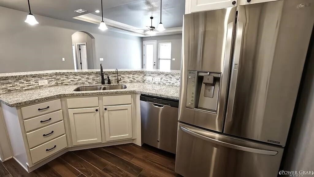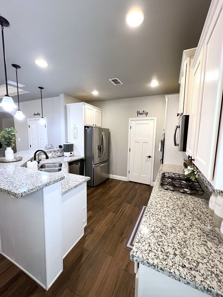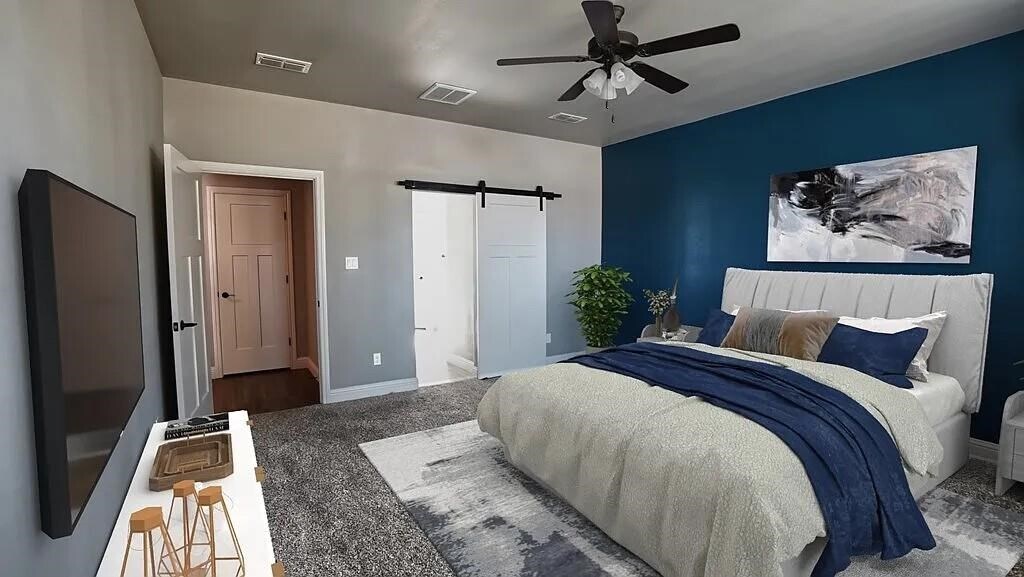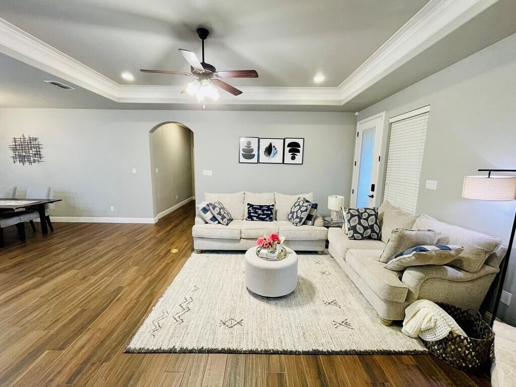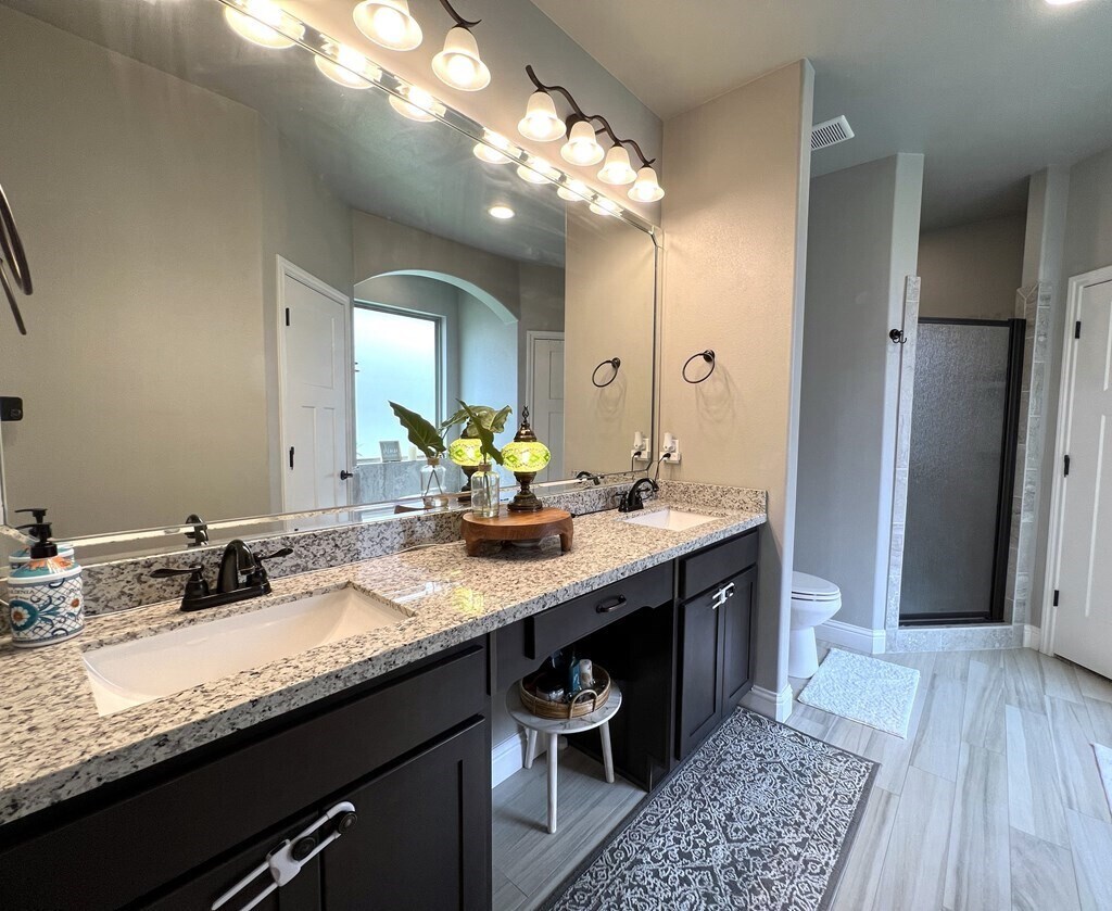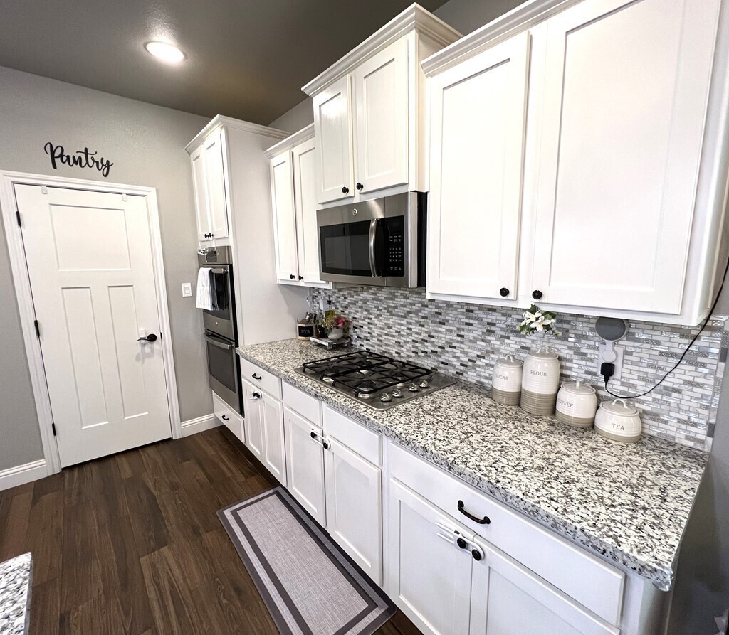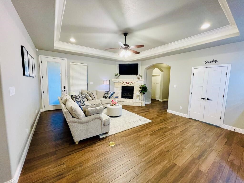 Stunning 3BR/3BA home in Enclave at Mission Ranch with 2 primary suites both w/ sep tub & shower, walk-in closets, high ceilings, barn doors, crown molding & tile floors. Chef's kitchen boasts granite countertops, stainless steel appliances, dual ovens, gas cooktop, LG fridge, RO & softener. Austin stone fireplace, gas heating, tankless water heater, smart thermostat, sprinklers & garage. Huge 8-ft fenced backyard w/ extended patio, lush lawn, gas line and garden bed.