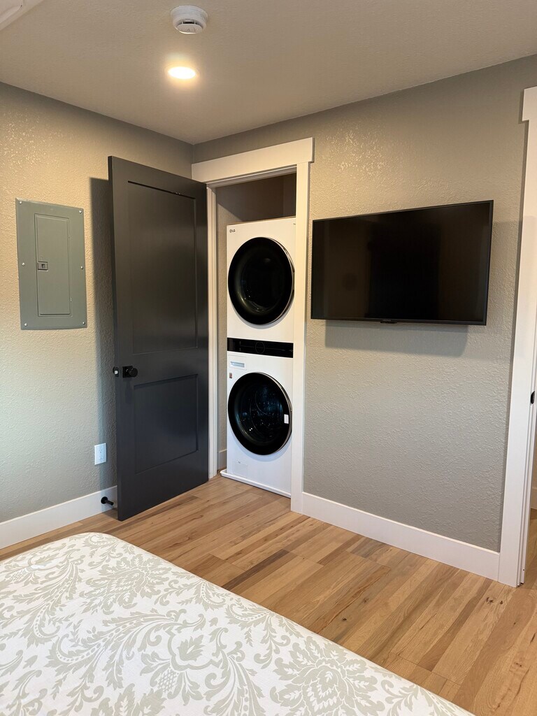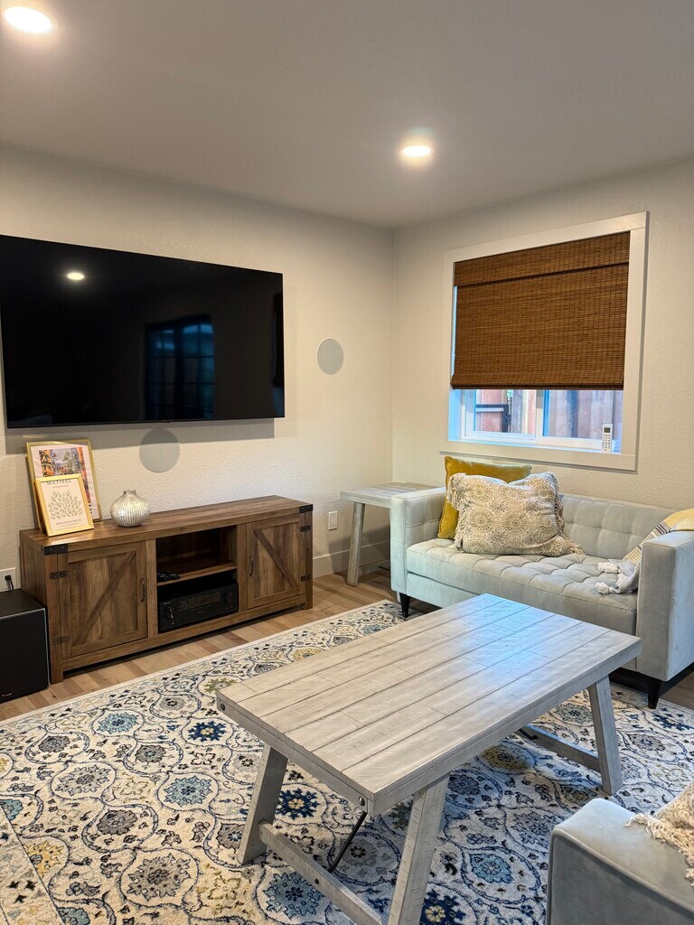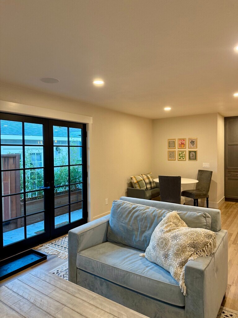 Six to twelve month lease would be optimal. Step into a brand-new meticulously crafted one-bedroom, one-bath ADU, offering 800 square feet of thoughtfully designed living space. The property features a secluded 600 square foot side yard with brand-new artificial grass for outdoor living. The ADU has its own private entrance, plenty of parking and a separate mailing address. We designed the ADU with custom wood Marvin French doors (lockable) and vinyl windows by Milgard which allow for natural light while blending beauty and energy efficiency. The chef's dream kitchen boasts of custom cabinets installed by Precision Cabinets, brand new (never used) premium appliances by LG (French door refrigerator, microwave, dishwasher & gas stove), a spacious quartz island perfect for entertaining, and a convenient hot water pot filler above the stove. All kitchen fixtures are from Kraus, known for their sleek and durable designs. We've also included a brand-new dining table, bench and chairs. The bathroom offers a spa-inspired experience with a Japanese soaking tub, designed for ultimate relaxation. Similar to the kitchen, the double bathroom sinks/fixtures are from Kraus. Custom cabinets by Precision, Delta shower finishes, French drain, walk in shower and niche all round out the luxurious bathroom. The main living space includes Sonos 5.1 in wall surround sound speakers, Pioneer Elite receiver, 70" TV, couch and twin pull out sleeper. The bedroom incorporates a "walk-through" closet to the bathroom, brand-new stackable washer and dryer by LG, a 42" TV, queen bed frame and brand-new mattress. The ADU has ~700 sqft of American manufactured solid 3/4 inch hickory flooring adding warmth and timeless elegance to the space. The walls are engineered for soundproofing, with an impressive STC rating of close to 60, ensuring peace and quiet. All interior doors are solid core. Super-efficient ceiling mounted mini-split units in both the main living area and bedroom provide personalized heating and cooling, while the eco-friendly tankless gas water heater guarantees endless hot water. The property also includes a dedicated water supply line for added convenience. Utilities and Technology Perks: High-speed internet access (2000 Mbps) and YouTube TV are included. Gas and water are included. The tenant will set up their own PG&E account for electricity via the ADU's separate electricity meter. The property is wired for Level 2 EV charging for eco-conscious convenience. Construction and all finishes were completed in December 2024. This exceptional space is largely furnished and is ideal for anyone seeking a beautifully designed brand-new independent living space. All furniture in photos are included in the lease. No smoking is allowed in or around the ADU. Don't miss out schedule your private tour today!