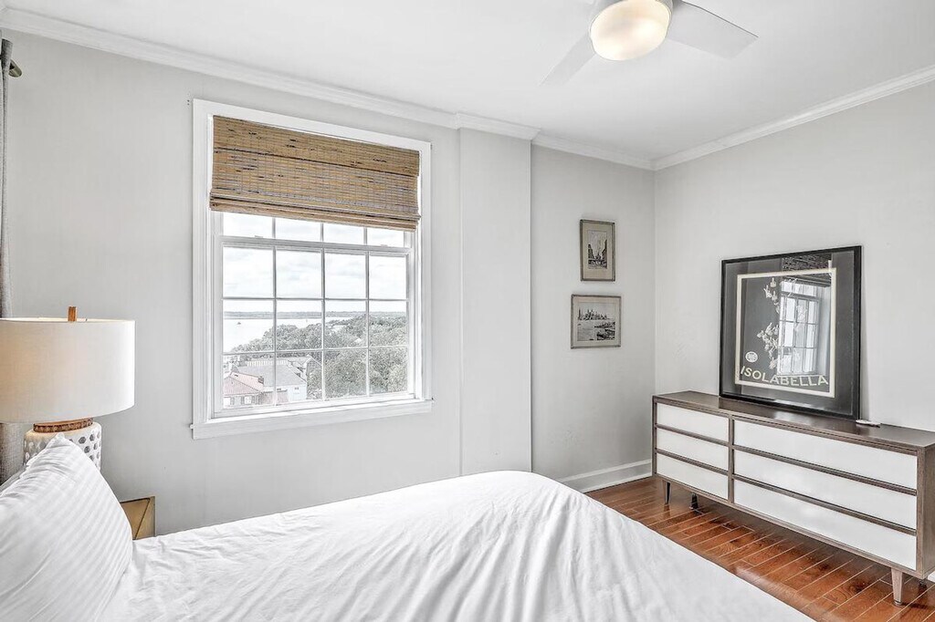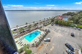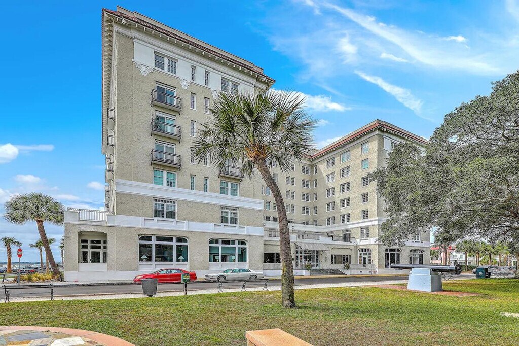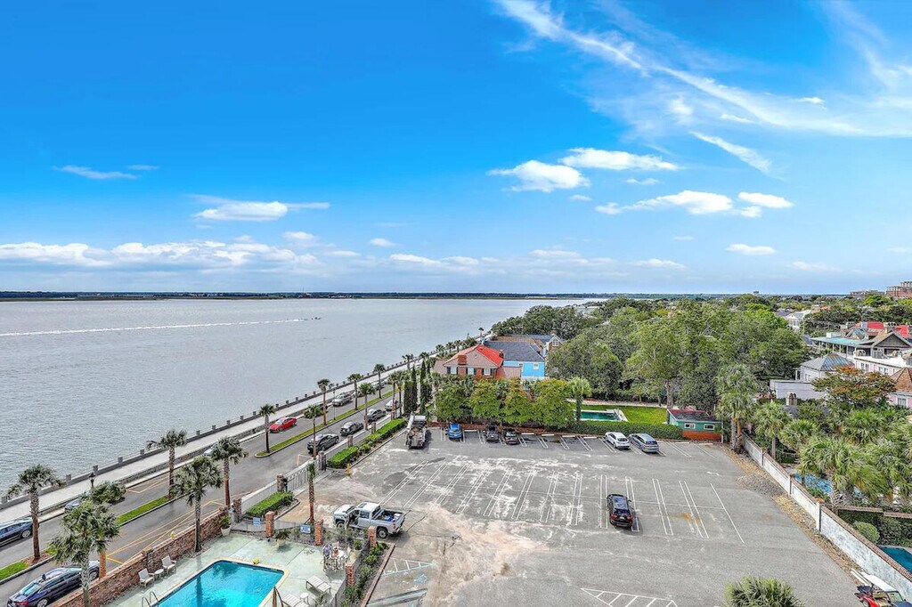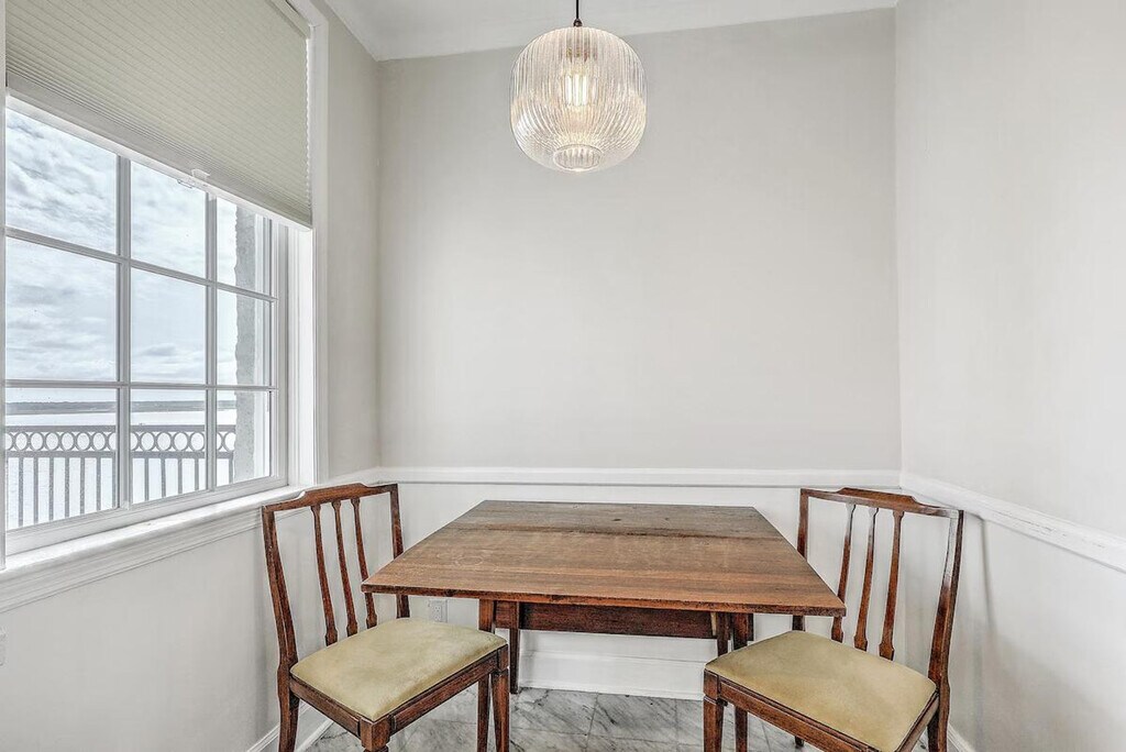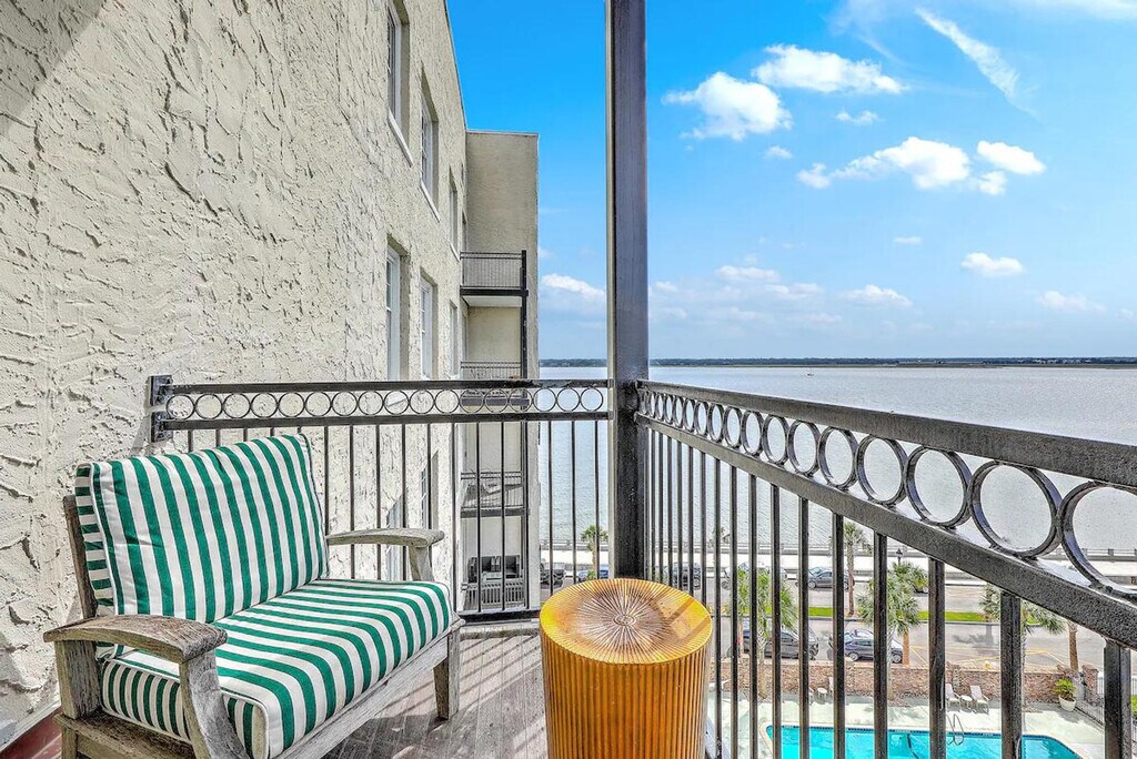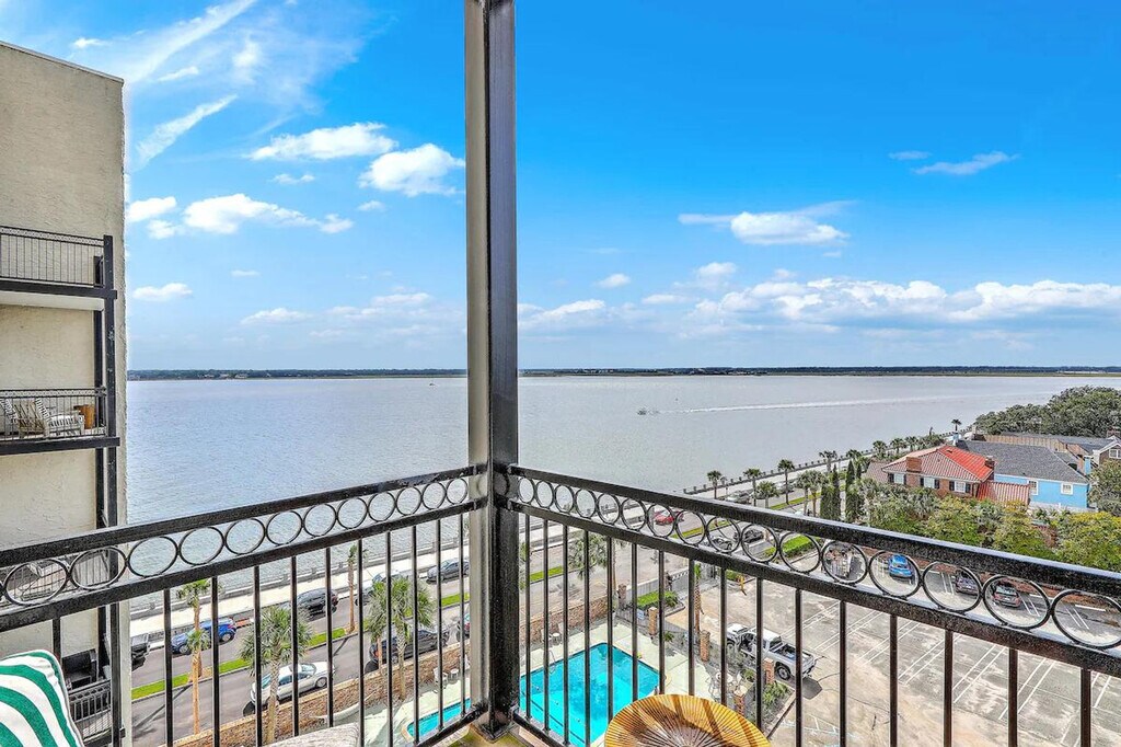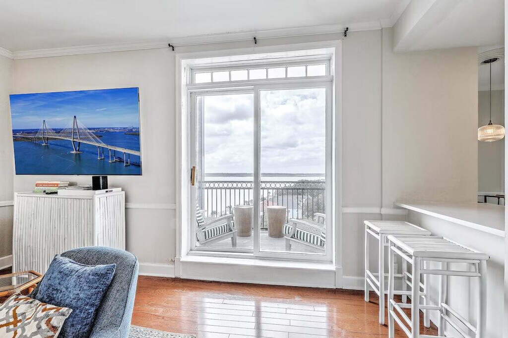 Feel at home in this stunning 1-bedroom, 1-bath condo on Ft Sumter House, perched on the iconic Charleston Battery, offering panoramic views of Charleston Harbor and Ashley River. This rare unit combines timeless elegance with modern comfort in one of the city's most coveted addresses. The open living room features a comfortable sofa sleeper and two chairs for lounging and a Smart TV. The recently updated kitchen has a bar top with seating for two, stainless steel appliances, plenty of cabinet space and a breakfast nook with a table with seating for two. Just off the living room, you will find the balcony with comfortable chairs and a small table, perfect for enjoying the water breezes and taking in the unforgettable view! The complex has 24-hour concierge and security, gated off-street parking, laundry facilities on site, a fitness center, swimming pool and bike rack. Utilities are included. Situated at the edge of Charleston's famed South of Broad neighborhood, The Fort Sumter House blends history with convenience. Stroll to world-class restaurants, art galleries, and shops along King Street, or simply enjoy peaceful walks along the Battery just steps from your door. [SI]