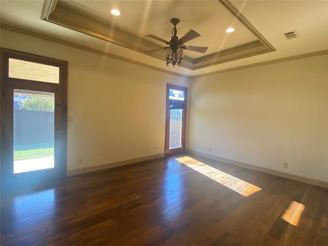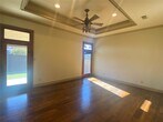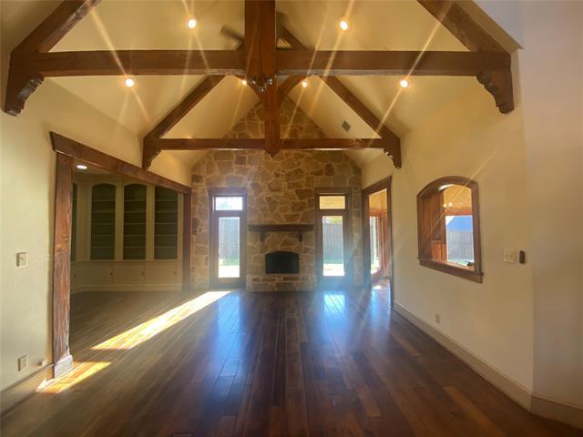 Exquisitely appointed custom with Chalet style beams and a Rustic Ranch game room upstairs that features a large covered balcony. Spacious living room with library, formal dining room a bedroom or office with full size bathroom located on the first level. Spacious living room with library, nice size kitchen with eat in breakfast nook area. Gorgeous wood floors, amazing primary suite with bay natural lighting to covered porch, SS appliances. Covered porch accessible from kitchen and primary bedroom. 3 car-garage, third garage is carpeted with in wall AC, previously used as an exercise room. Pets case by case. $195 Lease Admin Fee.