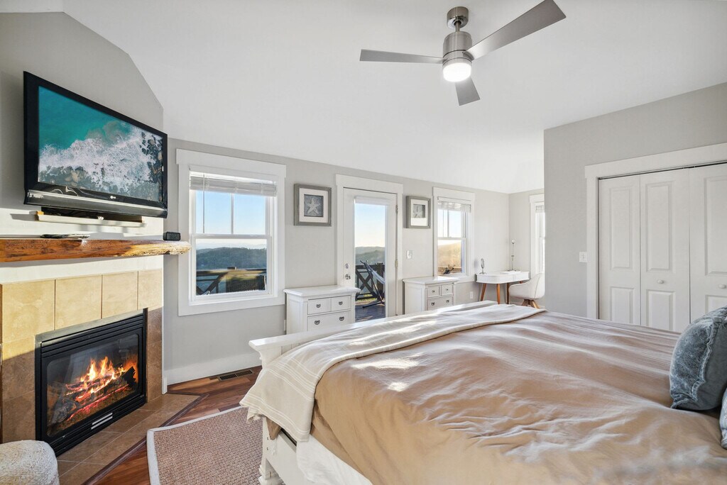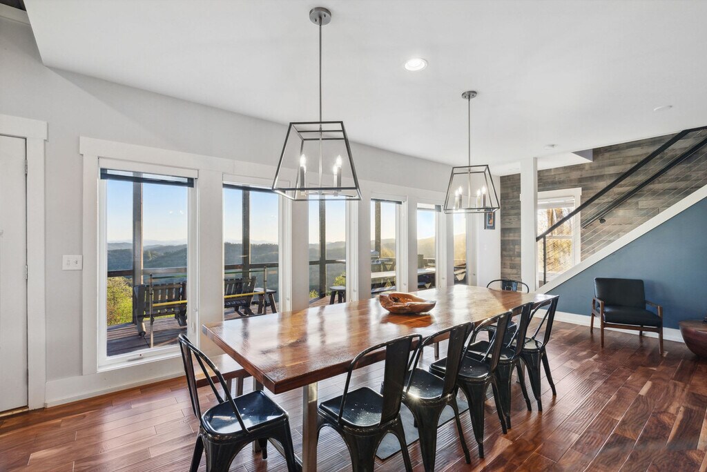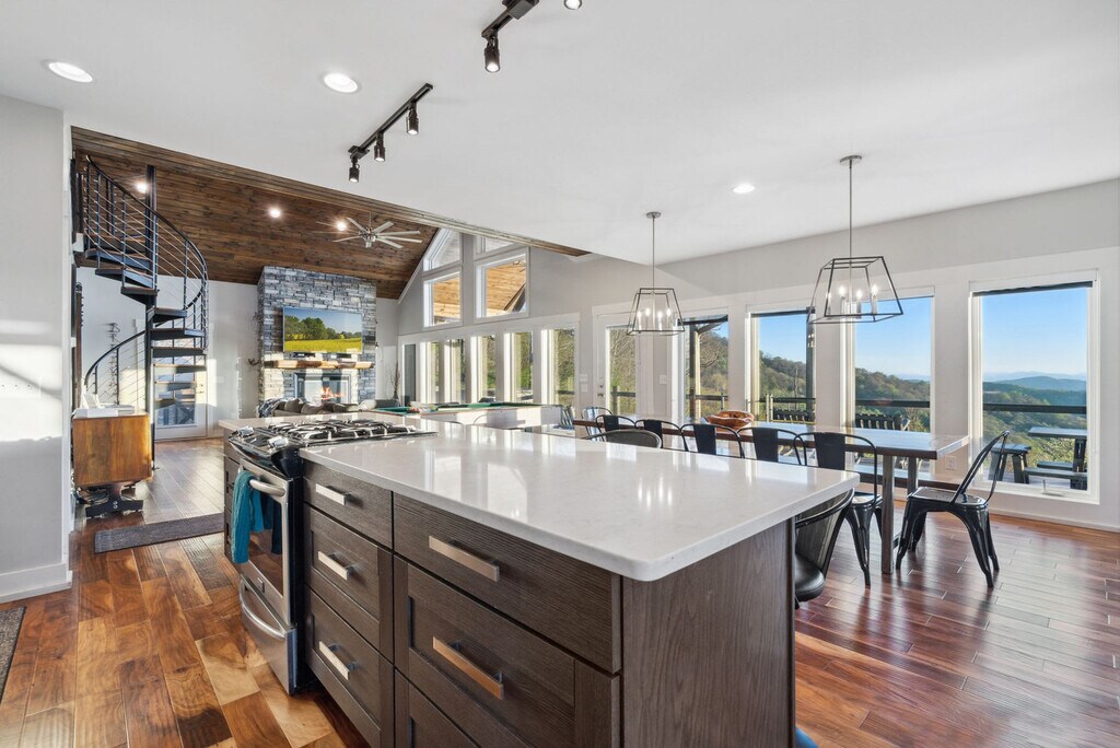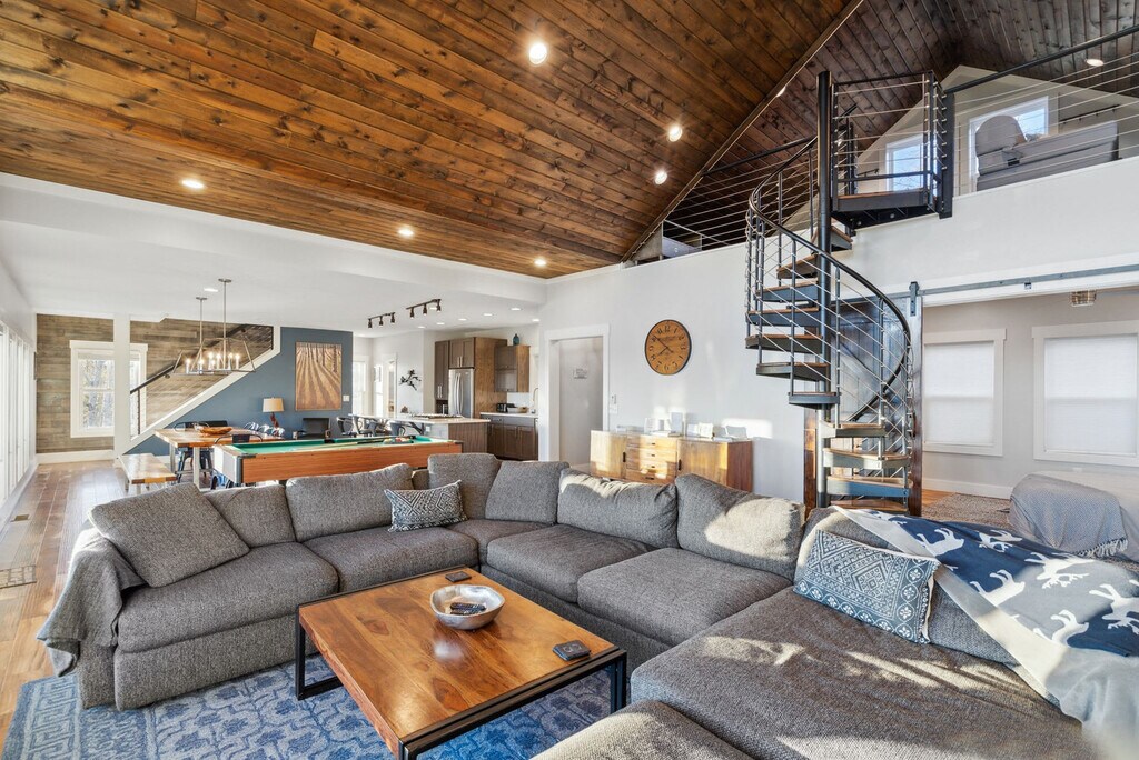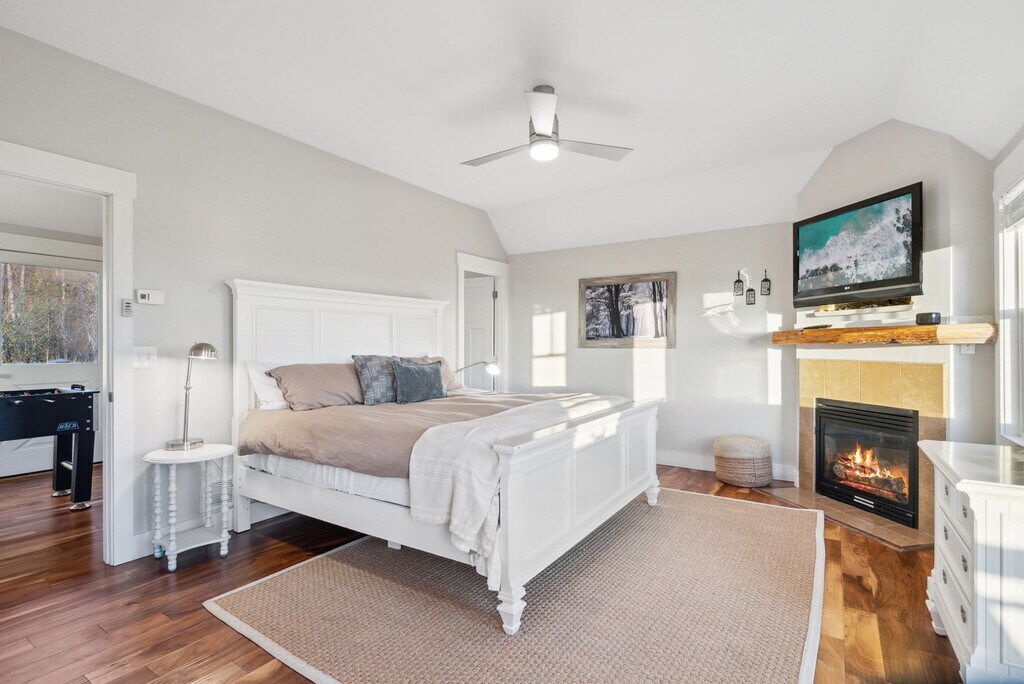 Feel at home in this newly renovated, luxe 3,100 sqft cabin, perfect for a fun mountain getaway. This cabin features 4 bedrooms and 3.5 bathrooms. This cabin has everything you need, including a private hot tub, fast Starlink Wi-Fi, a foosball table and pool table, panoramic mountain views, two decks, an outdoor fire pit, fireplaces, a fully stocked kitchen, ample parking, and smart TVs. The chef’s kitchen features an electric range, plenty of cooking space, and is fully equipped with a kettle and a drip coffee maker. There is also a large island and seating area with stools. The living room offers lots of natural lighting, a large sofa, a 70" Roku TV, a fireplace, and a pool table. Dogs are welcome for $125 per stay, with up to 2 dogs allowed. Check out Hatley Point for things to do nearby. The top floor primary bedroom features a plush king-size bed, Roku TV, full en-suite bathroom with a spacious stand-in shower and double vanity, a fireplace, and direct access to the deck. The main floor guest bedroom has a plush queen-size bed and an en-suite bathroom. The bottom floor guest bedroom has a queen bed and a Roku TV. The other bottom floor guest bedroom features bunk beds with three twin-size beds. The full bathroom is located in the hallway with a shower/tub combo. The loft has a full-size daybed and four twin-size flip chairs. Absolutely no parties are allowed, grounds for termination. Only 10 guests max at all times. A high-clearance SUV or AWD/4WD vehicle is strongly recommended year-round, as low-clearance vehicles (such as sedans or minivans) may not be able to reach the property, especially after rain or during winter months. Snow and icy conditions do occur in this area, and road conditions can change quickly. Guests are responsible for ensuring their vehicle is suitable for mountain terrain and weather. Quiet hours are between 10:00 PM and 7:00 AM. [SI]
