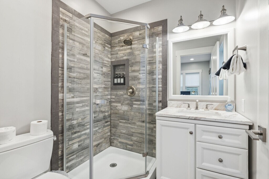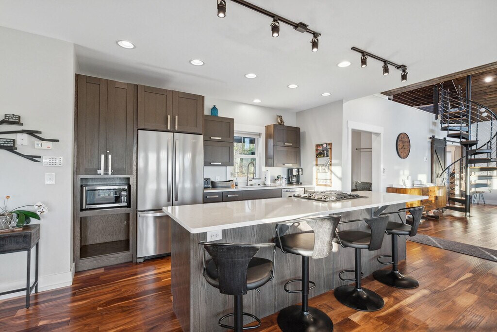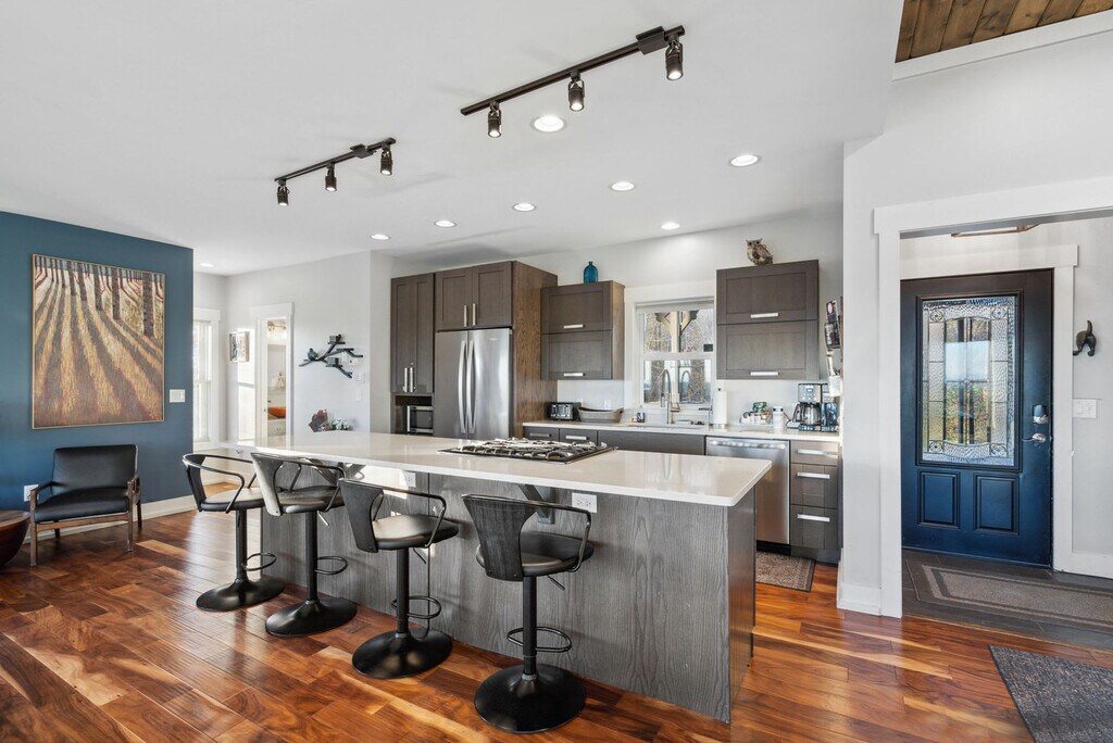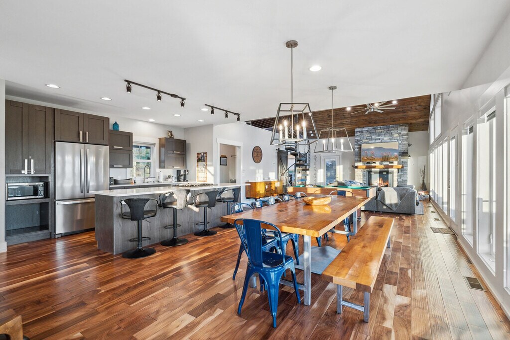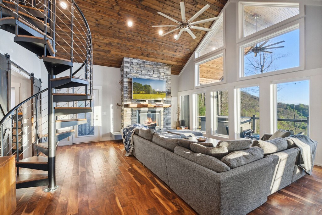 Feel at home in this newly renovated, luxe 3,100 sqft cabin, perfect for a fun mountain getaway. This cabin features 4 bedrooms and 3.5 bathrooms. This cabin has everything you need, including a private hot tub, fast Starlink Wi-Fi, a foosball table and pool table, panoramic mountain views, two decks, an outdoor fire pit, fireplaces, a fully stocked kitchen, ample parking, and smart TVs. The chef’s kitchen features an electric range, plenty of cooking space, and is fully equipped with a kettle and a drip coffee maker. There is also a large island and seating area with stools. The living room offers lots of natural lighting, a large sofa, a 70" Roku TV, a fireplace, and a pool table. Dogs are welcome for $125 per stay, with up to 2 dogs allowed. Check out Hatley Point for things to do nearby. The top floor primary bedroom features a plush king-size bed, Roku TV, full en-suite bathroom with a spacious stand-in shower and double vanity, a fireplace, and direct access to the deck. The main floor guest bedroom has a plush queen-size bed and an en-suite bathroom. The bottom floor guest bedroom has a queen bed and a Roku TV. The other bottom floor guest bedroom features bunk beds with three twin-size beds. The full bathroom is located in the hallway with a shower/tub combo. The loft has a full-size daybed and four twin-size flip chairs. Absolutely no parties are allowed, grounds for termination. Only 10 guests max at all times. A high-clearance SUV or AWD/4WD vehicle is strongly recommended year-round, as low-clearance vehicles (such as sedans or minivans) may not be able to reach the property, especially after rain or during winter months. Snow and icy conditions do occur in this area, and road conditions can change quickly. Guests are responsible for ensuring their vehicle is suitable for mountain terrain and weather. Quiet hours are between 10:00 PM and 7:00 AM. [SI]