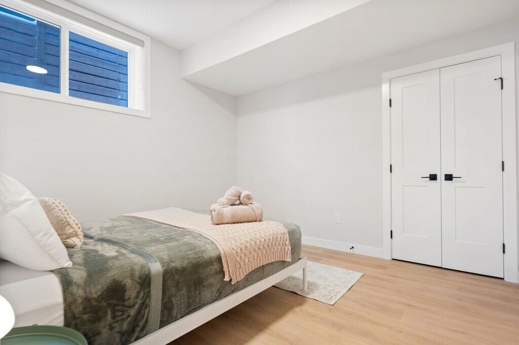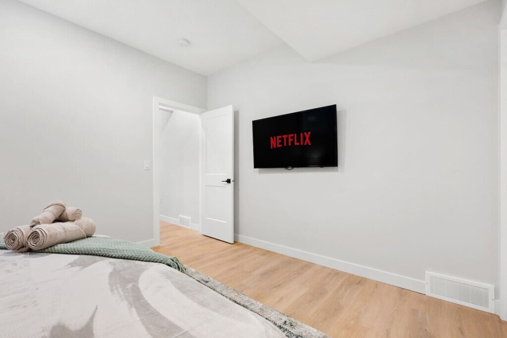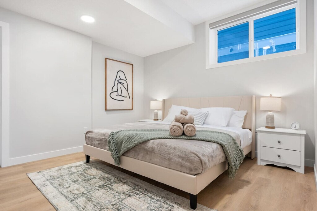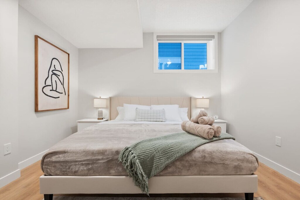 Experience the charm of Chestermere with this spacious private guest suite, just seconds from the canal. This luxurious suite offers a large living room with a reading nook and a 58" smart TV, ensuring you feel at home. Enjoy the convenience of free street parking and a fully equipped kitchen, complete with a dining table for four. The suite is designed for comfort and relaxation, featuring a cozy living room with a comfortable sofa, a mini library with board games, and high-speed internet. The kitchen is fully equipped with a 4-burner stove, oven, microwave, refrigerator, freezer, and dishwasher. Complimentary tea, coffee, and water are provided, along with a coffee maker, toaster, and blender. Enhance your stay with optional upgrades such as a National Park Entry, Welcome Basket, Birthday Decor Package, Romantic Wine and Flower Package, Spa at Home Package, Movie Night Upgrade, and more. A Pet Friendly Package is also available. Additional bedding and sleeping arrangements can be provided upon request. Located in a stunning lakeside retreat in Chestermere, this suite is steps from the lake and offers easy access to local attractions. It's a short drive to Chestermere Lake, John Peake Park, and Chestermere Recreation Centre. Enjoy shopping at East Hills Shopping Centre or explore the scenic trails at Anniversary Park. With easy highway access, you're just a short drive from Calgary and Banff National Park. This is a basement suite, and while efforts are made to ensure a peaceful stay, there may be some noise from upstairs tenants. The property has a strict no-smoking policy, with a $250 CAD fine for violations. Quiet hours are from 10 pm to 7 am, and no parties or excessive noise are allowed. Unauthorized late check-out will result in additional fees. The suite offers a remote work-friendly environment with high-speed internet and a comfortable living space, perfect for working from home.