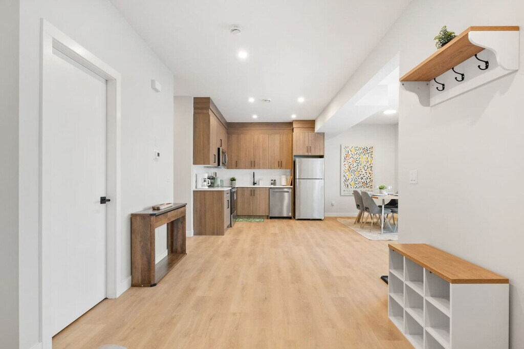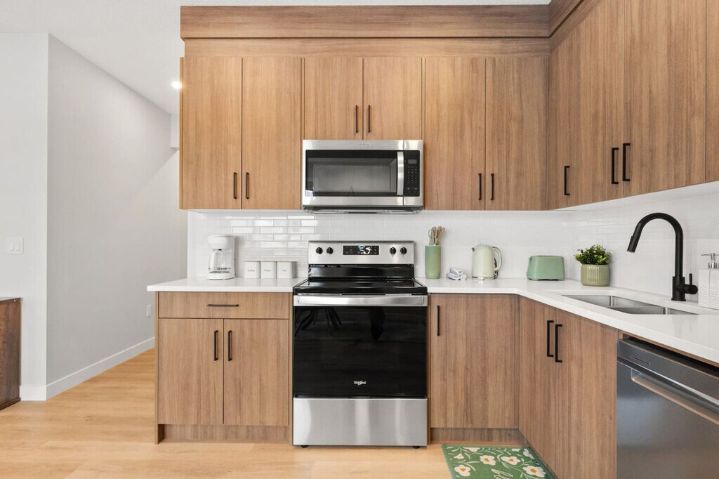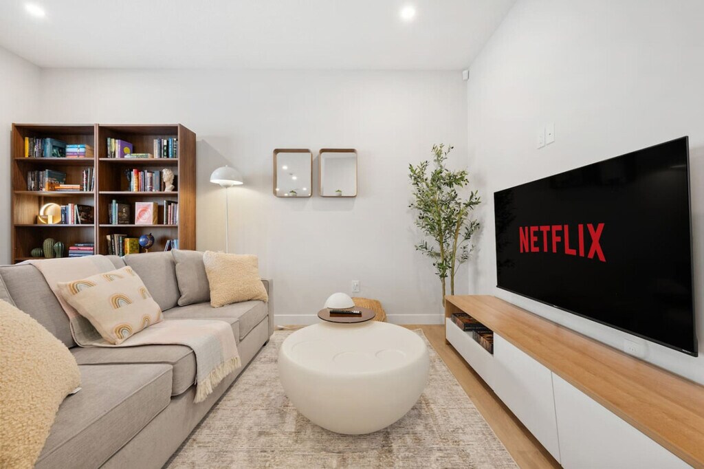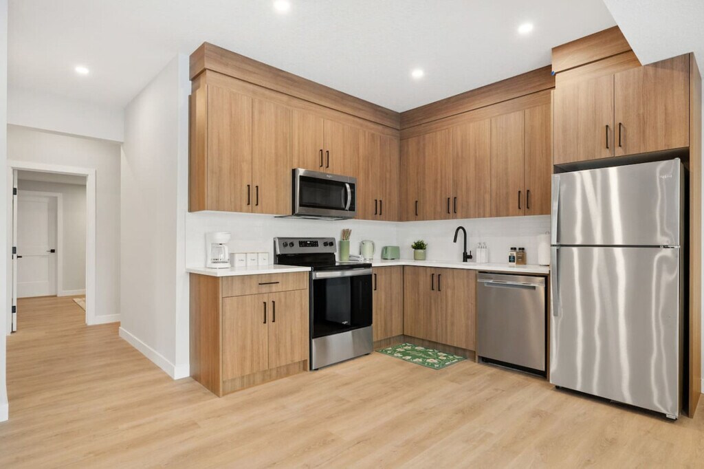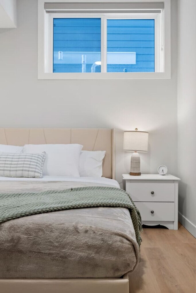 Experience the charm of Chestermere with this spacious private guest suite, just seconds from the canal. This luxurious suite offers a large living room with a reading nook and a 58" smart TV, ensuring you feel at home. Enjoy the convenience of free street parking and a fully equipped kitchen, complete with a dining table for four. The suite is designed for comfort and relaxation, featuring a cozy living room with a comfortable sofa, a mini library with board games, and high-speed internet. The kitchen is fully equipped with a 4-burner stove, oven, microwave, refrigerator, freezer, and dishwasher. Complimentary tea, coffee, and water are provided, along with a coffee maker, toaster, and blender. Enhance your stay with optional upgrades such as a National Park Entry, Welcome Basket, Birthday Decor Package, Romantic Wine and Flower Package, Spa at Home Package, Movie Night Upgrade, and more. A Pet Friendly Package is also available. Additional bedding and sleeping arrangements can be provided upon request. Located in a stunning lakeside retreat in Chestermere, this suite is steps from the lake and offers easy access to local attractions. It's a short drive to Chestermere Lake, John Peake Park, and Chestermere Recreation Centre. Enjoy shopping at East Hills Shopping Centre or explore the scenic trails at Anniversary Park. With easy highway access, you're just a short drive from Calgary and Banff National Park. This is a basement suite, and while efforts are made to ensure a peaceful stay, there may be some noise from upstairs tenants. The property has a strict no-smoking policy, with a $250 CAD fine for violations. Quiet hours are from 10 pm to 7 am, and no parties or excessive noise are allowed. Unauthorized late check-out will result in additional fees. The suite offers a remote work-friendly environment with high-speed internet and a comfortable living space, perfect for working from home.