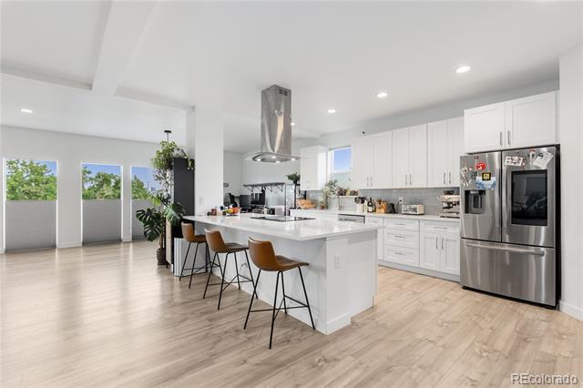 Experience modern Denver living with breathtaking city views at 1400 W Alaska Place, a stunning 2023-built home in the vibrant Athmar Park neighborhood. This contemporary residence features floor-to-ceiling windows and a large front balcony that capture panoramic views of the downtown skyline. Inside, the open-concept main level offers a bright and airy living and dining space, a chef’s kitchen with quartz countertops, stainless steel appliances, a spacious eat-in island, walk-in pantry, and a main-level bathroom for added convenience. Upstairs, the thoughtful layout includes a luxurious primary suite with a spa-like en-suite bath, three additional bedrooms, a full bathroom, and a laundry room. The oversized 1,250 sq ft garage—finished with epoxy floors, insulated walls, a mini-split system, and upgraded electrical—is perfect for a gym, workshop, or creative space. Additional upgrades include drought-tolerant xeriscaping, a $10K privacy fence, $8K electric blinds, and included washer and dryer. A high-end hot tub $16K and sauna $6K are also available and can be included with the right offer. Ideally located just 5 minutes from Washington Park, 10 minutes from downtown Denver, 3 minutes from Santa Fe Drive, and 2 minutes from I-25, this home also sits near the center of a highly anticipated potential Broncos stadium and entertainment district redevelopment—offering not just luxury living, but exceptional long-term value in one of the city's most dynamic growth areas. Single Family Residence MLS# 4980016