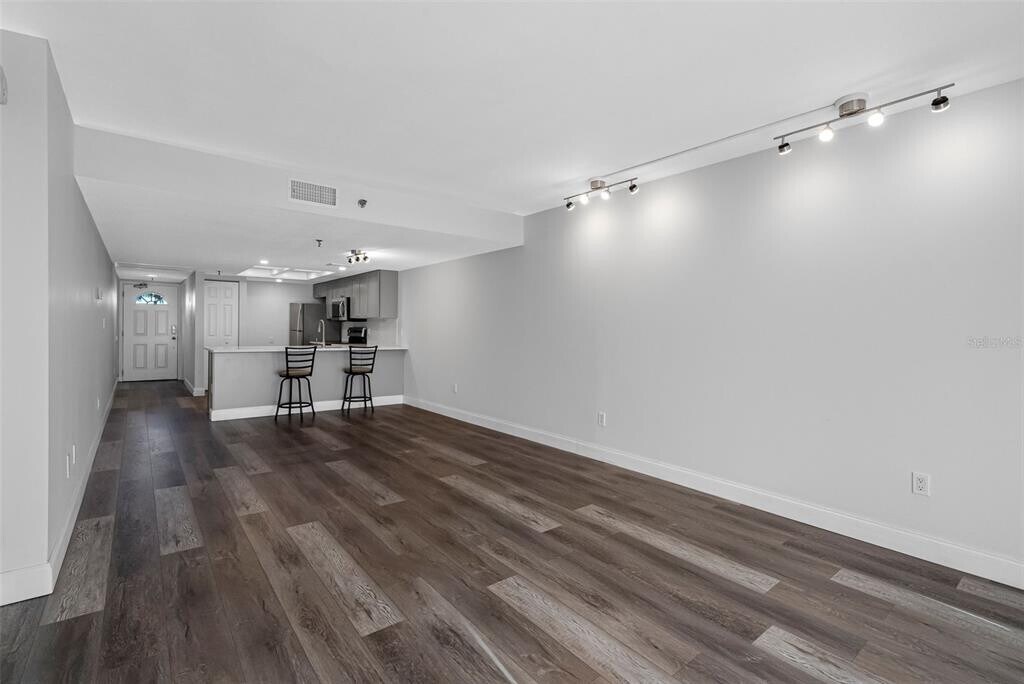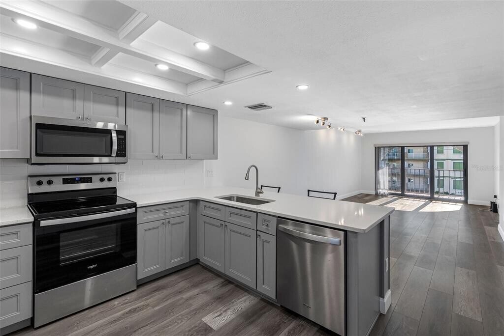 Beach access is directly across Gulf Boulevard,offering easy and quick access to the beach and the beautiful Gulf waters. This newly remodeled top-floor (4th-floor) condominium has one large bedroom and one and a half baths. Everything has been updated with designer finishes. The high-impact sliding glass doors offer safety and sound insulation. The kitchen has stainless Whirlpool appliances including dishwasher,refrigerator with ice maker,smooth top range and microwave. The large primary bedroom has a partial Gulf view and an oversized walk-in closet. The primary bath has a step-in shower and the guest bath is conveniently located off the hallway. The laundry room has a new GE stackable washer and dryer. The newer air conditioner is energy efficient and combined with the impact-resistant/insulated windows and sliding door results in energy efficiency. Internet service and cable are included. Luxury plank flooring throughout for that modern look and easy cleaning (no carpeting). The community has a large heated pool & patio deck and poolside restrooms. Close to several restaurants including the beachside Caddy’s Restaurant and Bar,coffee shops and John’s Pass Village and Boardwalk. No smoking or pets permitted. See video at MLS# TB8453756