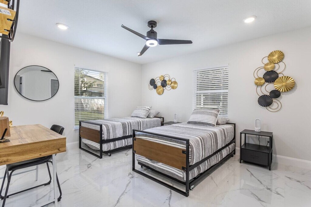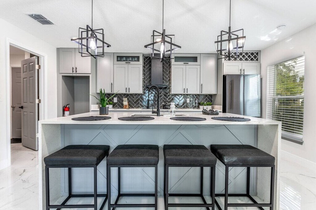 Feel at home in this newly rebuilt modern 4-bedroom, 3-bathroom home, centrally located just minutes from Downtown Orlando, ORMC Hospital, and theme parks. This fully furnished and stocked home offers approximately 2,000 sq ft with an open kitchen and large island. It features a fenced backyard, a living and dining area, and a laundry room. EV charging is available with a Level 2 Tesla charger for an additional fee of $100. A maximum of 2 small dogs are allowed per stay for a fee of $60 per dog. All dogs must be declared in advance. Street parking is available for up to 2 vehicles, and the driveway accommodates 2–3 vehicles parked back-to-back. No parties or loud noise are allowed; please respect quiet hours after dark. Smoking inside the property is strictly prohibited and will result in an automatic complaint. Check-in is at 4:00 PM, and check-out is at 10:00 AM. A security camera is installed outside near the entrance. We allow house-trained and non-aggressive dogs only. A crate is required if dogs are left alone indoors, and a leash is required when outside. No pets are allowed on furniture, and owners must clean up after their pets both indoors and outdoors. Includes a desk in the master bedroom and a desk/workspace in bedroom 4. [SI]