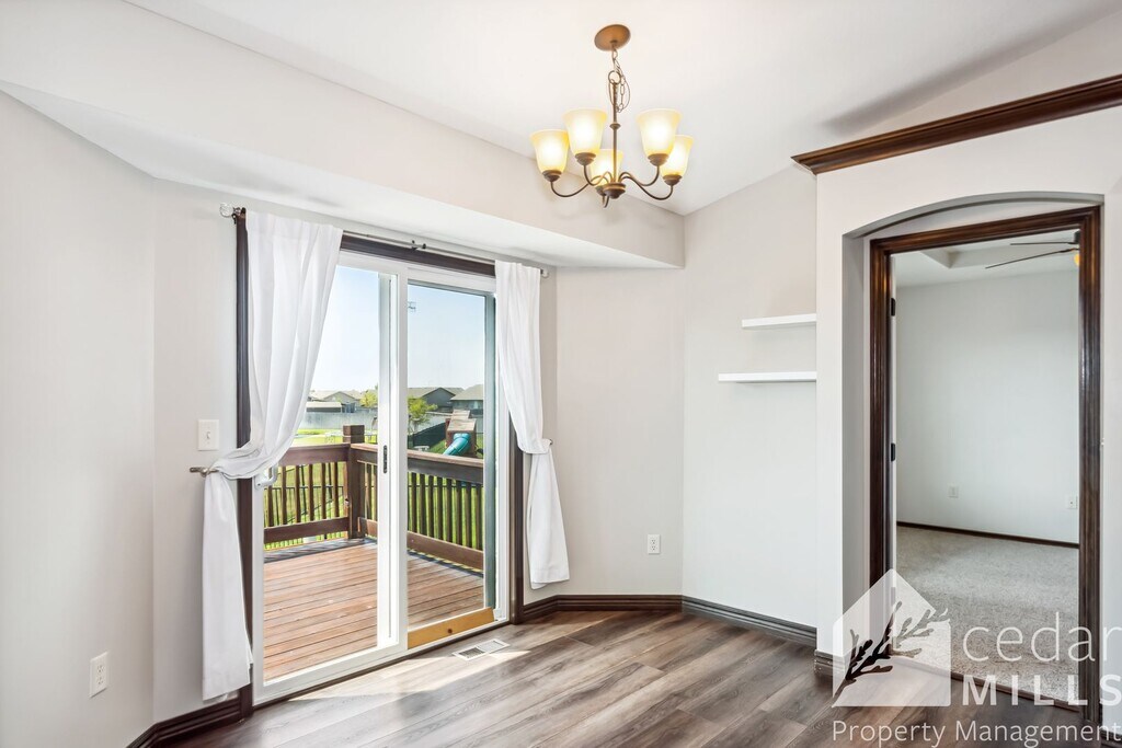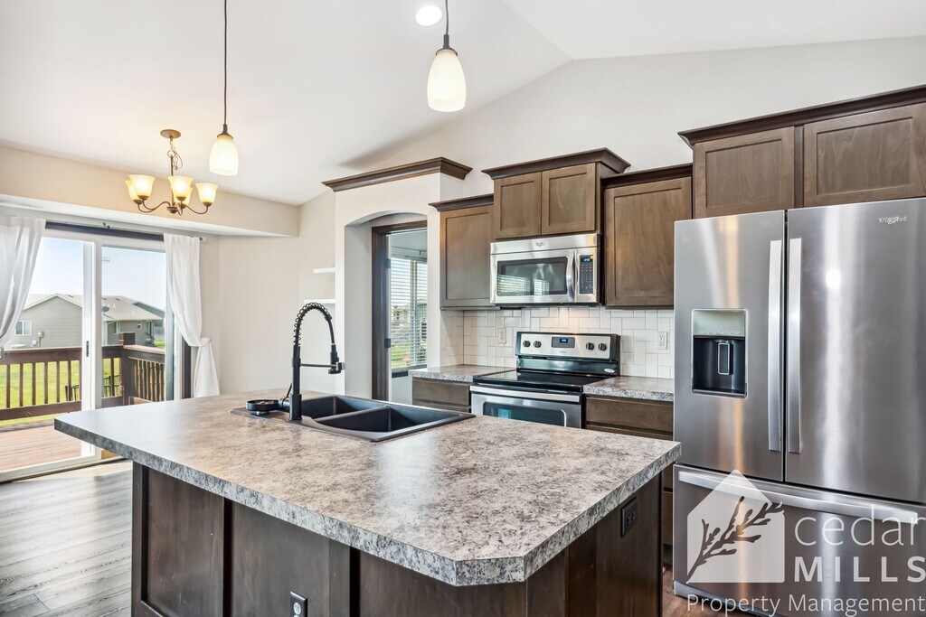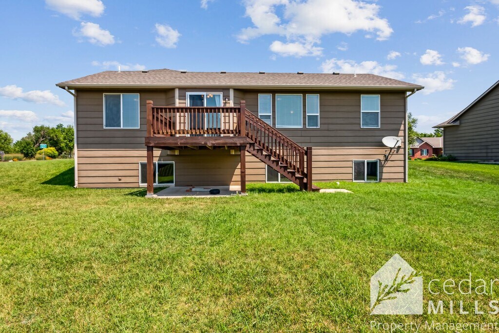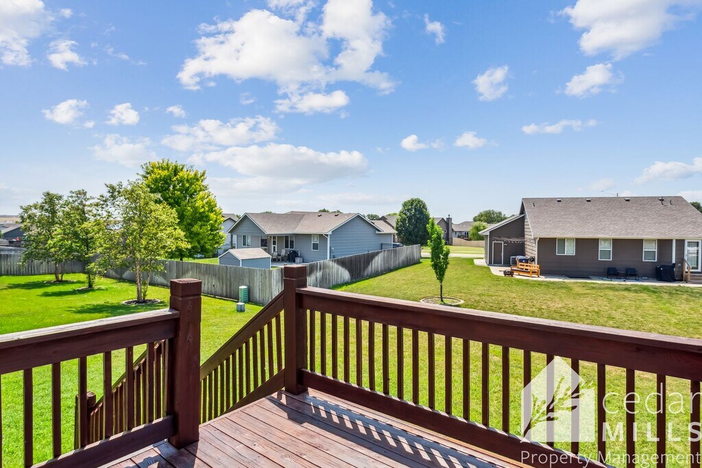 This super inviting 5 bedroom home is located just Northwest of 63rd and Rock in Derby. Upon entering you will immediately notice the contemporary plank floors and paint scheme along with open floor plan and new kitchen appliances. The master is beyond the kitchen, has en suite bath with custom wall paper and walks through to the laundry room. On the other side of the home are 2 more bedrooms and a hall bath. Sliding patio door walks you out to a nice wood deck overlooking a large yard. Downstairs are 2 more bedrooms, 3rd bath and large finished basement. Outside is an attached 3 car garage. Rent $2400 Deposit $2400 plus $150 move in fee App fee $40 per adult