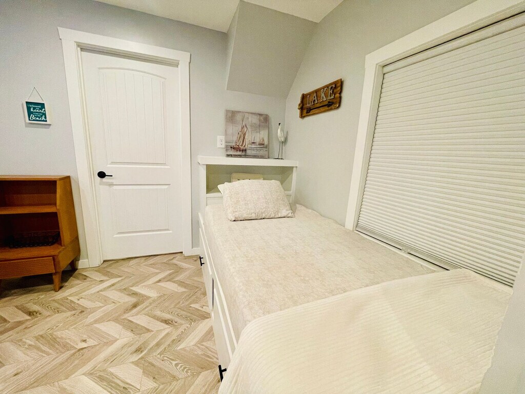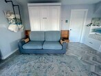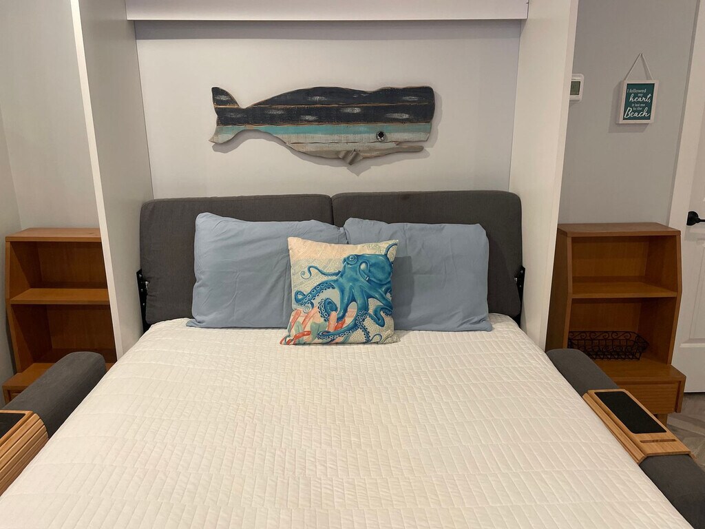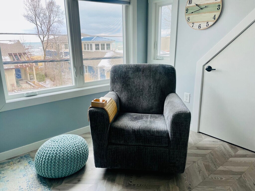 Feel at home in this charming studio apartment with views of Lake Michigan from your own private space. This studio apartment features a queen-size Murphy bed with a very comfortable Purple mattress and an additional twin bed with storage underneath. The bathroom has a walk-in shower. There is a full-size refrigerator, an apartment-size stove, a microwave, and a gas grill. The apartment also includes a couch, two swivel chairs, and a dining table for four. This apartment is in a quiet, residential lake community with lake access across the street. It is centrally located near Washington Park, Washington Park Zoo, Fish Camp Restaurant, a boat launch, and more. This apartment requires a minimum stay of 30 days and is above a real estate office. Guests must be 24 to rent and complete a pre-arrival form, agreeing to rental conditions and uploading an ID. [SI]