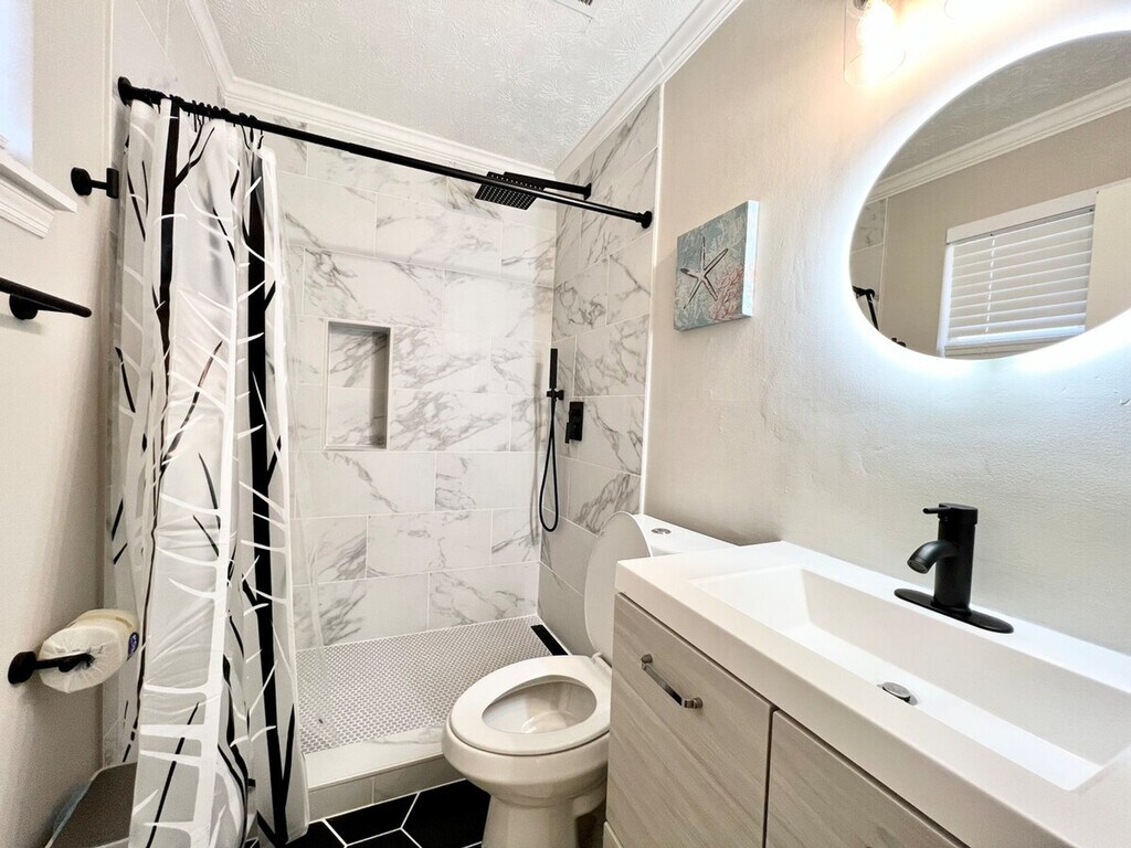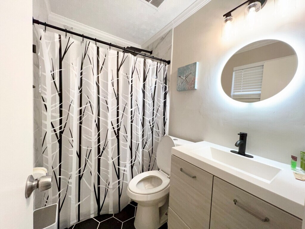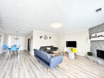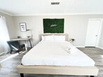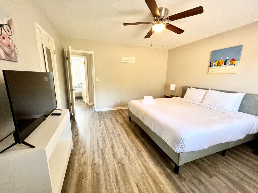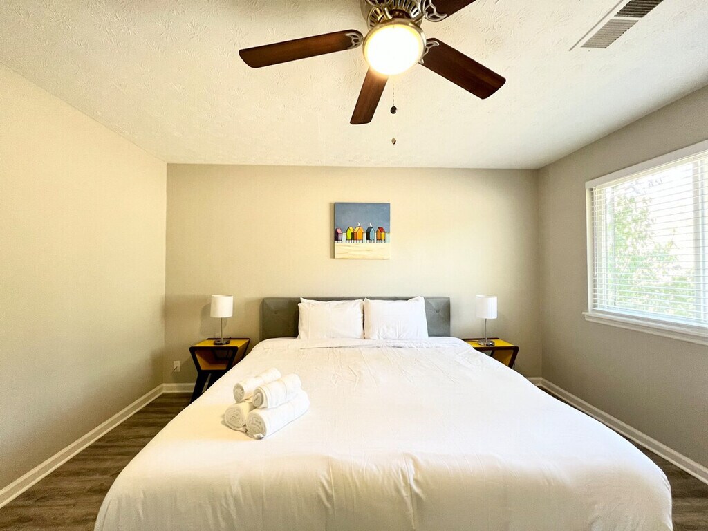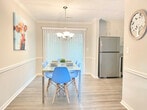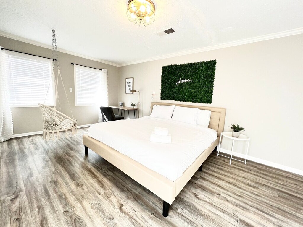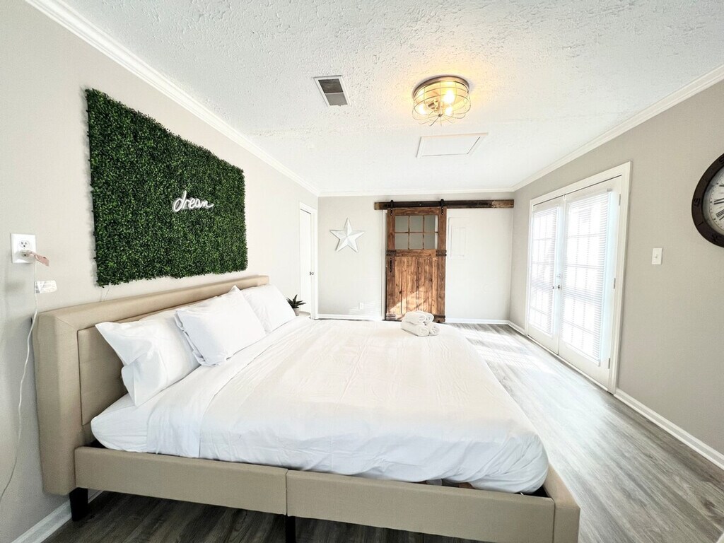 Welcome to the charming "House on a Hill," a Mid-Century Modern styled ranch house located in the heart of Norcross. This unique home features three bedrooms and two bathrooms, comfortably accommodating up to eight guests. With its bright and modern decor, this house offers a warm and homely feeling, perfect for families, big groups, or business travelers. Please note that the driveway is steep, and parking is limited to three standard-sized cars. Inside, the home is beautifully decorated with a mix of mid-century and modern furniture. The master bedroom boasts a king-size bed and a spacious master bathroom, while the second and third bedrooms each feature a queen-size bed. A bonus room includes another king-size bed and a working desk. The living room offers a comfortable sofa and a smart TV with free Netflix/Roku and basic local channels. The open-concept kitchen is equipped with stainless steel appliances and basic kitchenware for simple meals. Guests can enjoy high-speed internet and a cooling and heating system with humidifier control for added comfort. A washer and dryer are available for long-stay guests. For guests traveling with pets, small pets under 25 lbs may be approved with prior authorization and a non-refundable pet fee of $150 per pet per stay, with a maximum of two pets allowed. Mid-stay cleaning services can be requested for an additional fee. Conveniently located in Norcross, this home provides easy access to local amenities and attractions. The property is equipped with exterior cameras for added security, ensuring guests' privacy inside the home. Guests will have access to the entire house, except for the garage and a few locked owner's closets. Check-in is at 4 PM, and check-out is strictly at 10 AM, with a penalty fee of half the night’s stay for late check-out. Smoking, including electronic cigarettes, is prohibited within 10 feet of the property, with a $250 cleaning charge for violations. The maximum capacity is ten people, and no unregistered guests are allowed overnight. Parking is limited to four standard-sized cars, with no overnight street parking allowed. The property is pet-free unless prior authorization is given. Guests are required to follow all community guidelines and keep the property clean. The house is equipped with quarterly pest control, but guests should be aware of the local climate's potential for insects and pests. The home includes a working space with a desk, perfect for those who need to work in style during their stay. High-speed internet is available to support remote work needs.