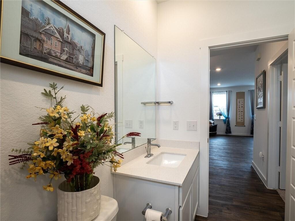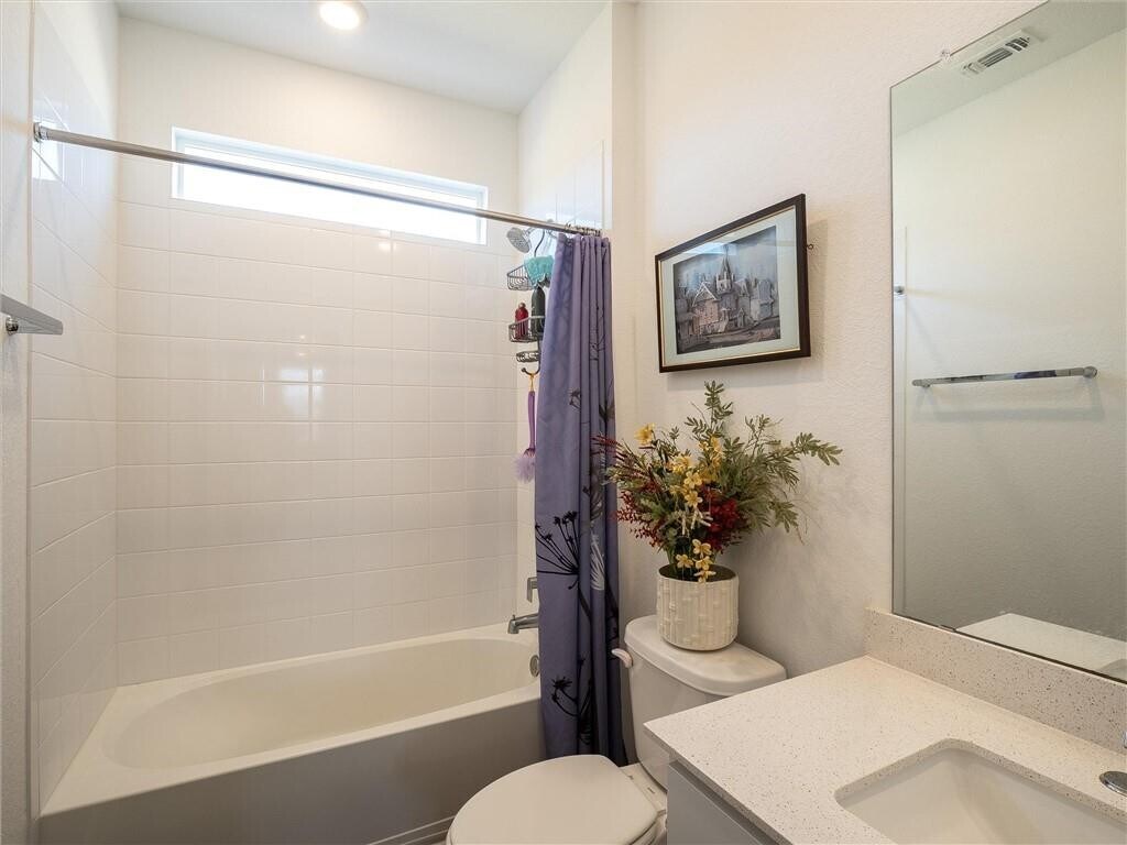 This modern,1.5 story home has an open floorplan,4 bedrooms,3 full bathrooms. There are 3 bedrooms on the main floor,and 1 large bedroom and full bath upstairs perfect as the primary,a guest suite or for a teenager who wants their own space. Located in the highly rated Canterra North subdivision in Pflugerville,this property has easy access to shopping,entertainment,medical services and more. The kitchen features a gas stove and center island that most people want in their kitchen. Don’t miss seeing this one!