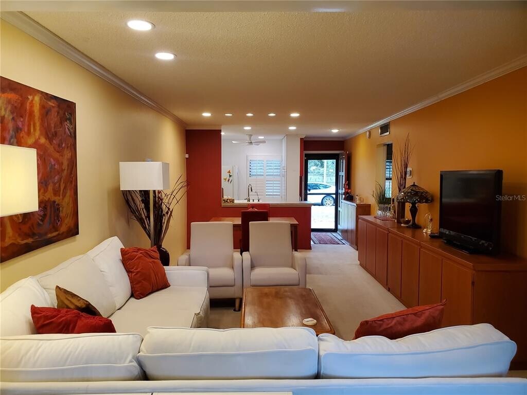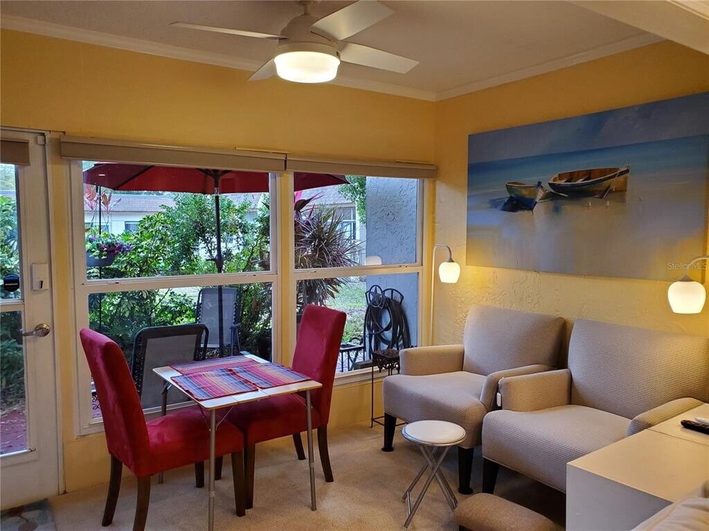 Beautifully furnished 2-bedroom,2-bath villa in the desirable 55+ Mission Hills community of Clearwater. This well-maintained unit offers an assigned covered carport,exterior storage,and an inviting open floor plan. The updated kitchen features white cabinetry,abundant storage,and overlooks the spacious living and dining area enhanced with recessed lighting. An extended Florida room—finished with a raised floor to create a seamless flow—provides excellent additional living space. Inside laundry with washer and dryer adds convenience. The generous primary bedroom includes an en-suite bathroom with a walk-in shower and ample closet space. The guest bedroom is comfortably furnished with two twin beds. Step outside to a private paved patio surrounded by lush landscaping,perfect for relaxing or entertaining. The monthly fee includes cable,internet,natural gas,water,sewer,trash,roof,exterior maintenance,grounds care,and full use of the community amenities. Mission Hills is an active 55+ community offering a clubhouse with social room,library,fitness area,billiards,ping pong,shuffleboard,and a large heated pool. Excellent Clearwater location close to restaurants,shopping,grocery stores,hospitals,airports,entertainment,beaches,and the charming downtowns of Safety Harbor and Dunedin. MLS# TB8453741