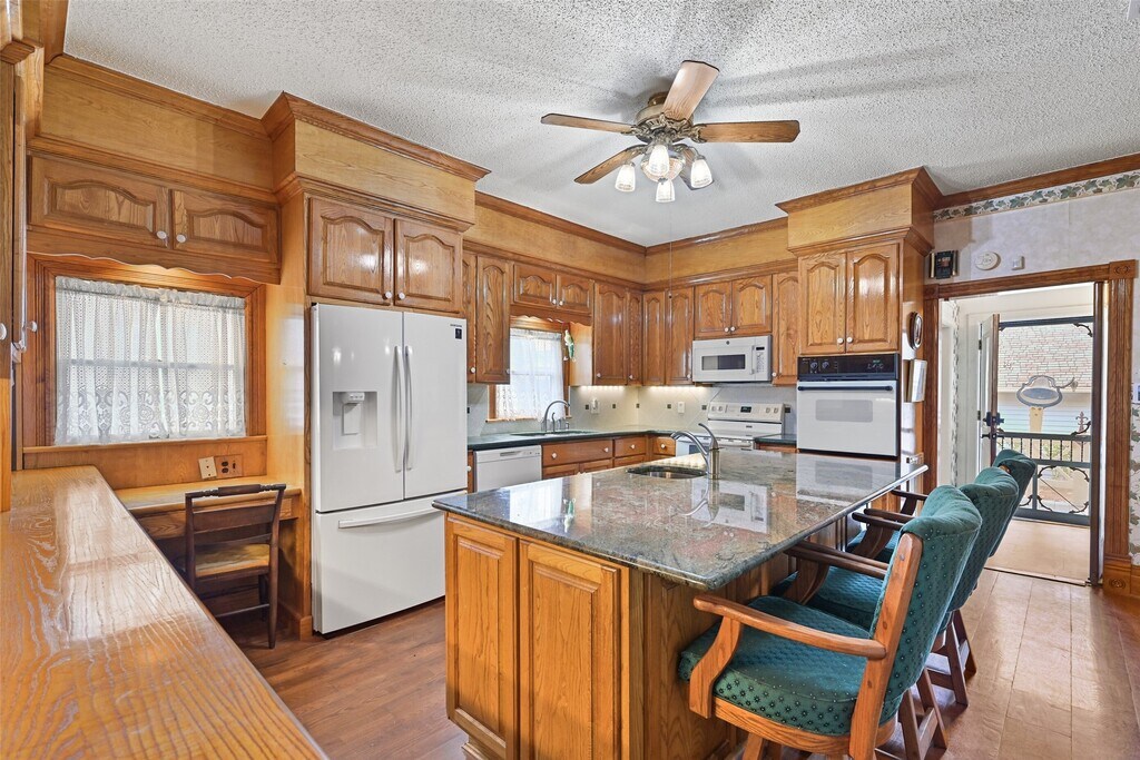 Recorded as a Texas Historic Landmark in 2007,The Powhatan S. Wren home has graced the corner across from the Bishop’s Palace and Sacred Heart Church for over 100 years. Possessing all the historic charm that you would expect,this home is welcoming from the front porch to the back porch and beyond. Beautifully and lovingly maintained,experience yesteryear while enjoying today’s modern conveniences. Gleaming hardwood floors grace the formal living and dining rooms with soaring ceilings. The ample yet intimate parlor is anchored by an impressive gas fireplace. An island/eat-at snack bar takes center stage in the very large kitchen with lots of beautiful custom wooden cabinets and granite countertops. Open to the breakfast room and formal dining room beyond,this inviting kitchen will become a favorite gathering place. Conveniently located on the main floor,the primary bedroom bath has a large shower and double sinks. There are 3 bedrooms up with a large sitting area. MLS# 27437547